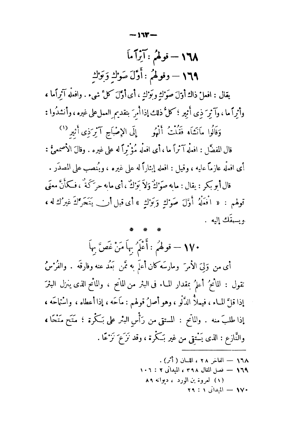 قَالَ الْمفضل افعله آثراً مَا أَي افعله مؤثراً لَهُ على غَيره