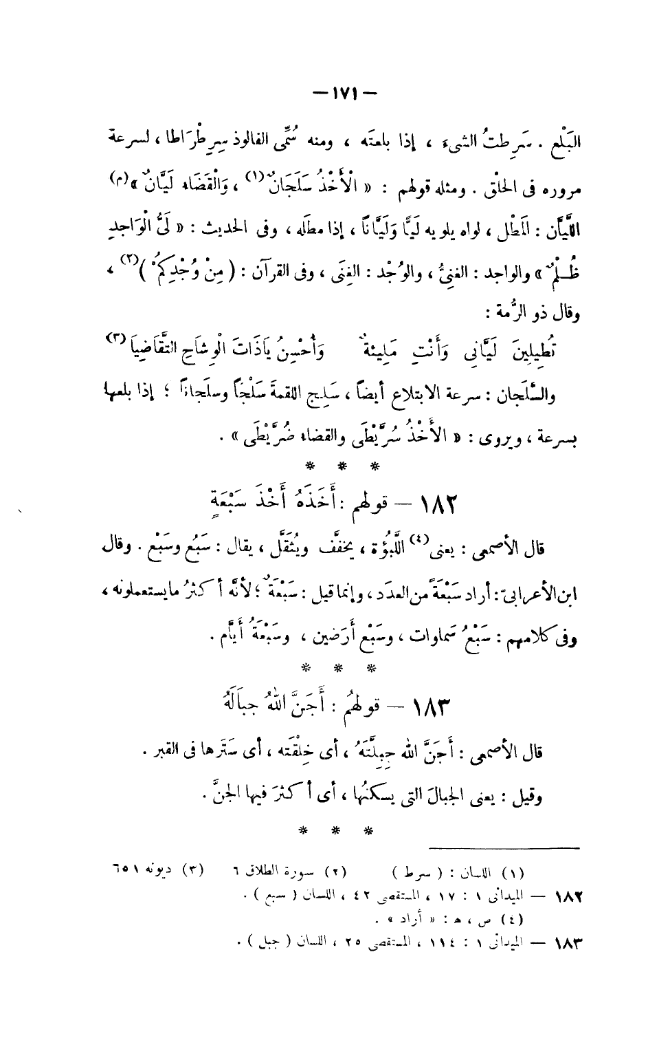 وَمثله قَوْلهم (الْأَخْذ سلجان وَالْقَضَاء ليان) الليان المطل لواه يلويه لياً ولياناً إِذا مطله وَفِي الحَدِيث (لي الْوَاجِد ظلم) والواجد الْغَنِيّ والوجد الْغنى وَفِي الْقُرْآن {من وجدكم} وَقَالَ ذُو الرمة
