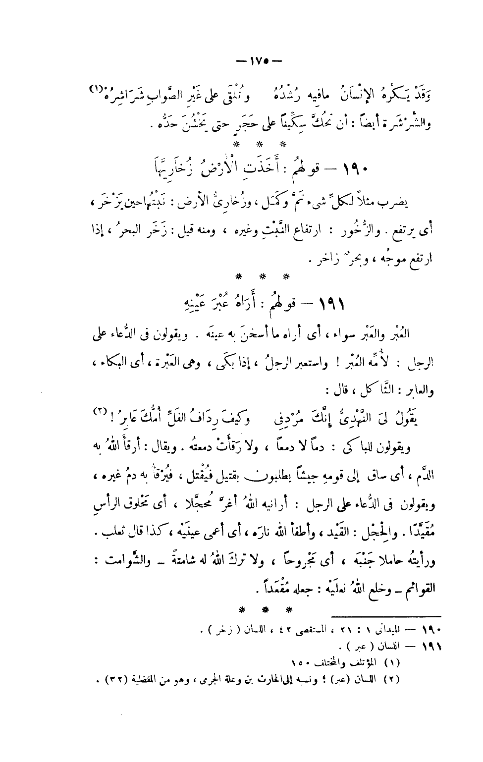وَيَقُولُونَ للباكي دَمًا لَا دمعاً وَلَا رقأت دمعته وَيُقَال أرقأ الله بِهِ الدَّم أَي سَاق إِلَى قومه جَيْشًا يطْلبُونَ بقتيل فَيقْتل فيرقأ بِهِ دم غَيره وَيَقُولُونَ فِي الدُّعَاء على الرجل أرانيه الله أغر محجلاً أَي محلوق الرَّأْس مُقَيّدا