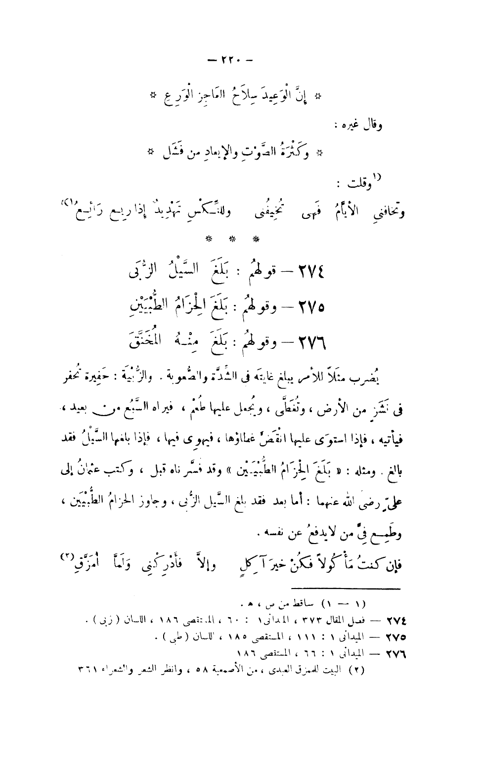وَمثله (بلغ الحزام الطبيين) وَقد فسرناه قبل وَكتب عُثْمَان إِلَى عَليّ رَضِي الله عَنْهُمَا أما بعد فقد بلغ السَّيْل الزبى وَجَاوَزَ الحزام الطبيين وطمع فِي من لَا يدْفع عَن نَفسه