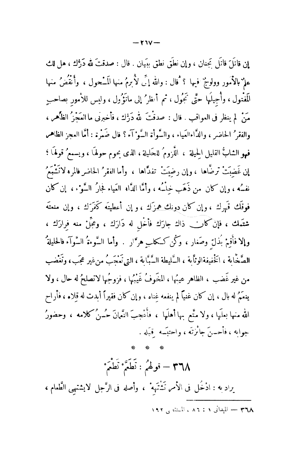 قَالَ صدقت لله دَرك فَأَخْبرنِي مَا الْعَجز الظَّاهِر والفقر الْحَاضِر والداء العياء والسوأة السوآء قَالَ ضَمرَة أما الْعَجز الظَّاهِر فَهُوَ الشَّاب الْقَلِيل الْحِيلَة اللُّزُوم للحليلة الَّذِي يحوم حولهَا وَيسمع قَوْلهَا إِن غضِبت ترضاها وَإِن رضيت تفداها وَأما الْفقر الْحَاضِر فالمرء لَا تشبع نَفسه وَإِن كَانَ من ذهب خلسه وَأما الدَّاء العياء فجار السوء إِن كَانَ فَوْقك قهرك وَإِن كَانَ دُونك همزك وَإِن أَعْطيته كفرك وَإِن منعته شتمك فَإِن كَانَ ذَاك جَارك فأخل لَهُ دَارك وَعجل مِنْهُ فرارك وَإِلَّا فأقم بذل وصغار وَكن ككلب هرار