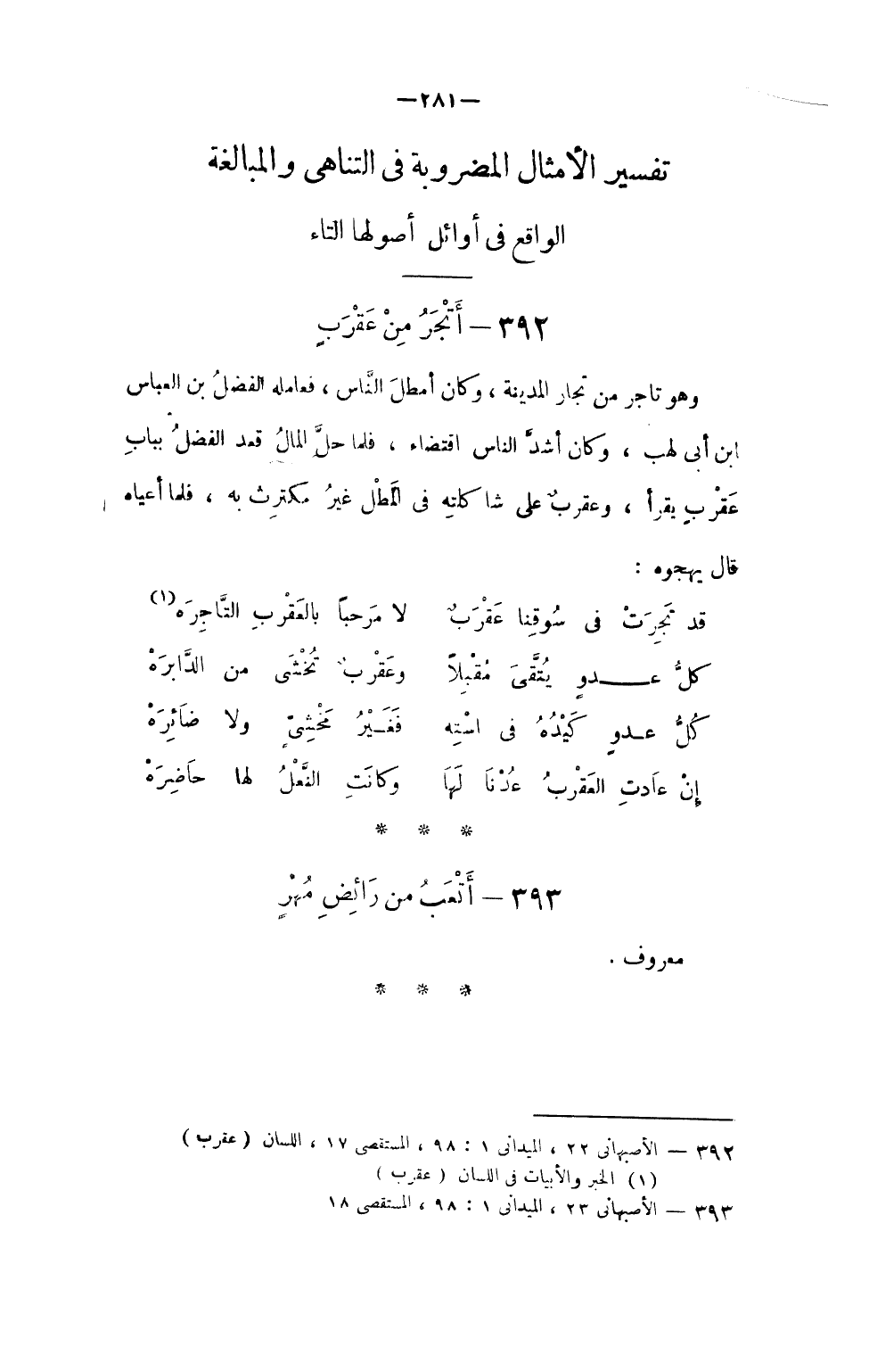 (قد تجرت فِي سوقنا عقرب ... لَا مرْحَبًا بالعقرب التاجره)