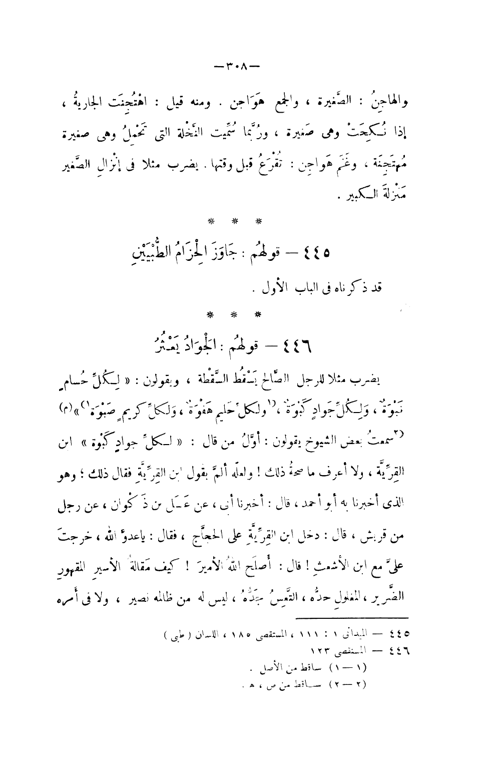 يضْرب مثلا للرجل الصَّالح يسْقط السقطة وَيَقُولُونَ (لكل حسام نبوة وَلكُل جواد كبوة وَلكُل حَلِيم هفوة وَلكُل كريم صبوة) سَمِعت يعَض الشُّيُوخ يَقُولُونَ أول من قَالَ (لكل جواد كبوة) ابْن الْقرْيَة وَلَا اعرف مَا صِحَة ذَلِك وَلَعَلَّه ألم بقول ابْن الْقرْيَة فَقَالَ ذَلِك وَهُوَ الَّذِي أخبرنَا بِهِ أَبُو أَحْمد قَالَ أخبرنَا أبي عَن عسل بن ذكْوَان عَن رجل من قُرَيْش قَالَ دخل ابْن الْقرْيَة على الْحجَّاج فَقَالَ يَا عَدو الله خرجت عَليّ مَعَ ابْن الْأَشْعَث قَالَ أصلح الله الْأَمِير كَيفَ مقَالَة الْأَسير المقهور الضَّرِير المغلول حَده التعس جده لَيْسَ لَهُ من ظالمه نصير وَلَا فِي أمره