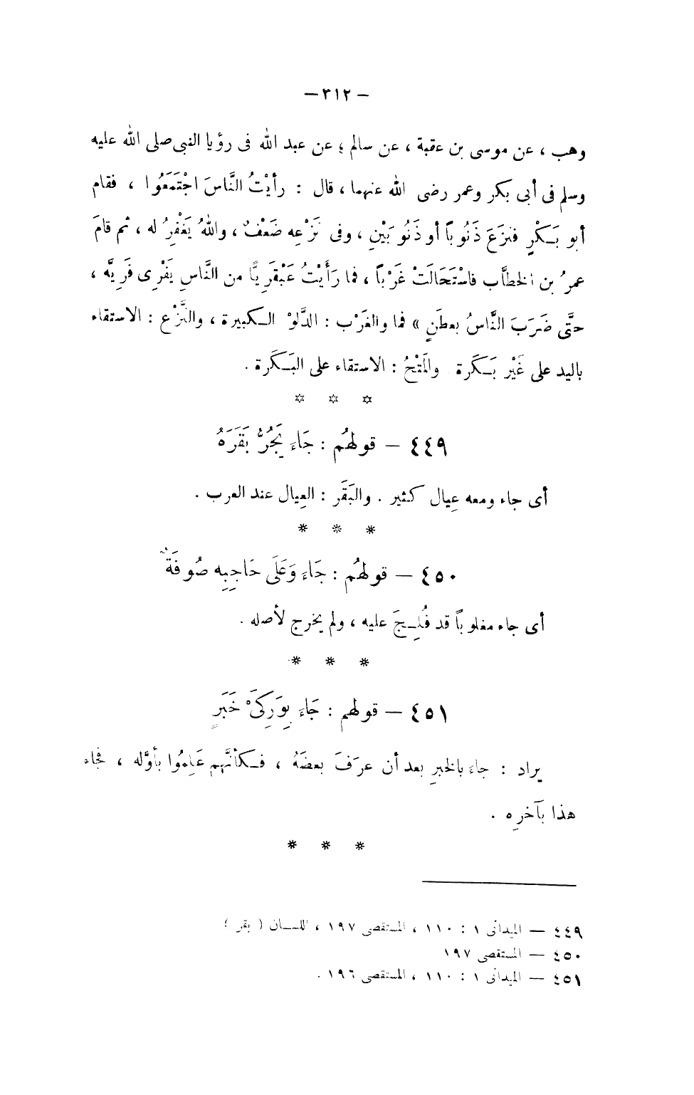 وهب عَن مُوسَى بن عقبَة عَن سَالم عَن عبد الله فِي رُؤْيا النَّبِي صلى الله عَلَيْهِ وَسلم فِي أبي بكر وَعمر رَضِي الله عَنْهُمَا قَالَ رَأَيْت النَّاس اجْتَمعُوا فَقَامَ أَبُو بكر فَنزع ذنوباً أَو ذنوبين وَفِي نَزعه ضعف وَالله يغْفر لَهُ ثمَّ قَامَ عمر بن الْخطاب فاستحالت غرباً فَمَا رَأَيْت عبقرياً من النَّاس يفري فريه حَتَّى ضرب النَّاس بِعَطَن فَمَا والغرب الدَّلْو الْكَبِيرَة والنزع الاستقاء بِالْيَدِ على غير بكرَة والمتح الاستقاء على البكرة