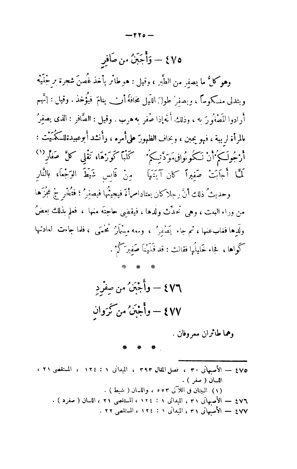 وَحَدِيث ذَلِك أَن رجلا كَانَ يعْتَاد امْرَأَة فيجيئها فيصفر فَتخرج عجزها من وَرَاء الْبَيْت وَهِي تحدث وَلَدهَا فَيَقْضِي حَاجته مِنْهَا فَعلم بذلك بعض وَلَدهَا فَغَاب عَنْهَا ثمَّ جَاءَ يصفر وَمَعَهُ مِسْمَار محمىً فَلَمَّا جَاءَت لعادتها كواها فجَاء خليلها فَقَالَت قد قلينا صفيركم