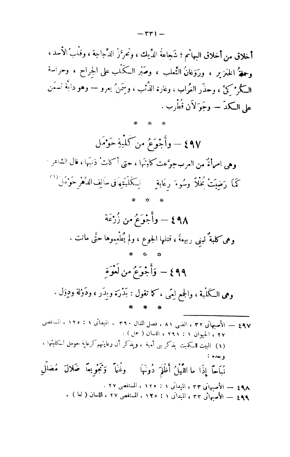 أَخْلَاق من أَخْلَاق الْبَهَائِم شجاعة الديك وتحرز الدَّجَاجَة وقلب الْأسد وَحَملَة الْخِنْزِير وروغان الثَّعْلَب وصبر الْكَلْب على الْجراح وحراسة الكركي وحذر الْغُرَاب وغارة الذِّئْب وَسمن يعرو وَهُوَ دَابَّة تسمن على الكد وجولان قطرب