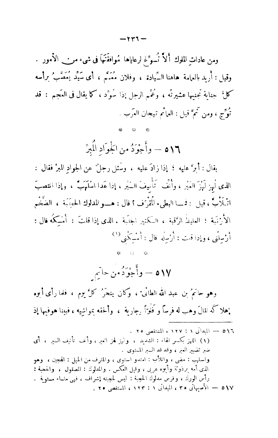 وَهُوَ حَاتِم بن عبد الله الطَّائِي وَكَانَ ينْحَر كل يَوْم فَلَمَّا رأى أَبوهُ إهلاكه المَال وهب لَهُ فرسا وفلواً وَجَارِيَة وألحقه بمواشيه فَبينا هُوَ فِيهَا إِذْ