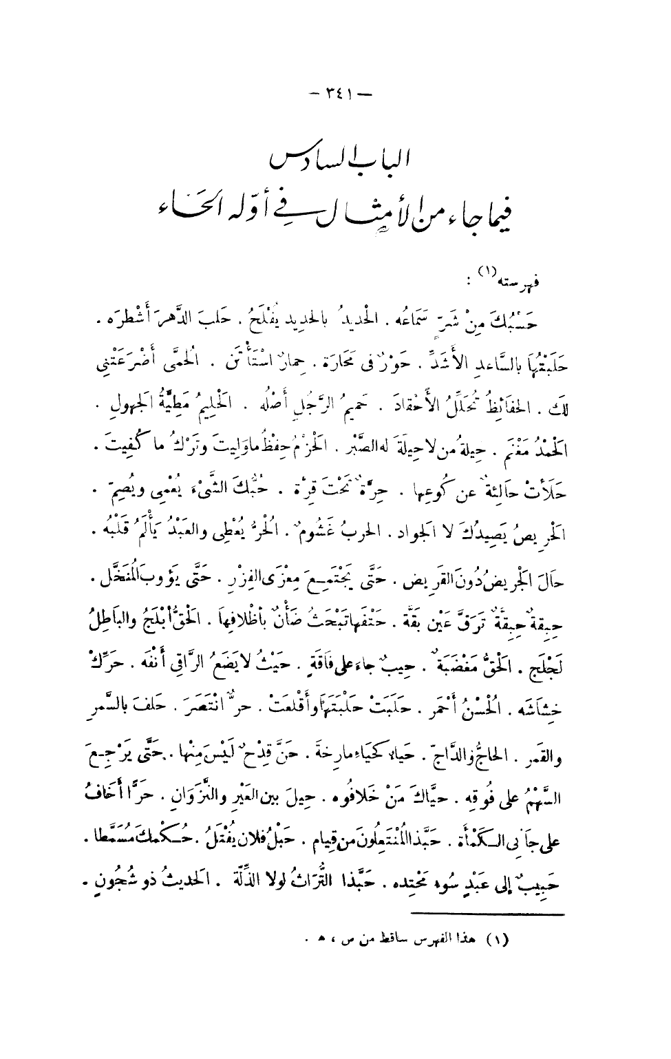 الْبَاب السَّادِس فِيمَا جَاءَ من الْأَمْثَال فِي أَوله الْحَاء