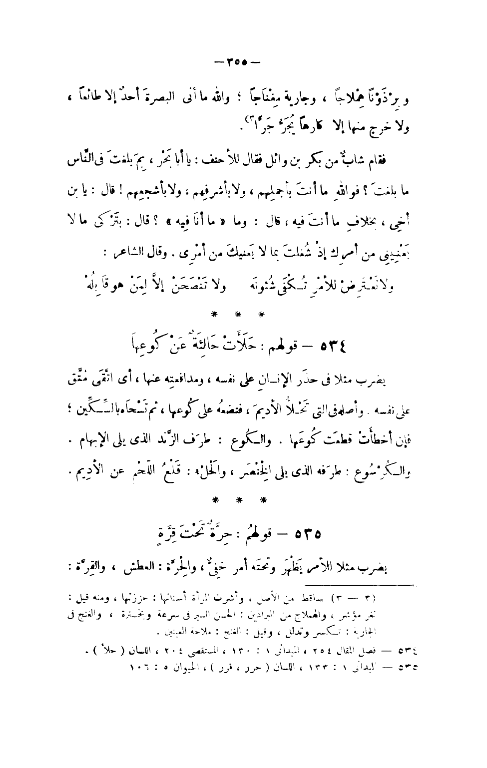 فَقَامَ شَاب من بكر بن وَائِل فَقَالَ للأحنف يَا أَبَا بَحر بِمَ بلغت فِي النَّاس مَا بلغت فوَاللَّه مَا أَنْت بأجملهم وَلَا بأشرفهم وَلَا بأشجعهم قَالَ يَا بن أخي بِخِلَاف مَا أَنْت فِيهِ قَالَ وَمَا (مَا أَنا فِيهِ) قَالَ بتركي مَا لَا يعنيني من أَمرك اذا شغلت بِمَا لَا يَعْنِيك من أَمْرِي