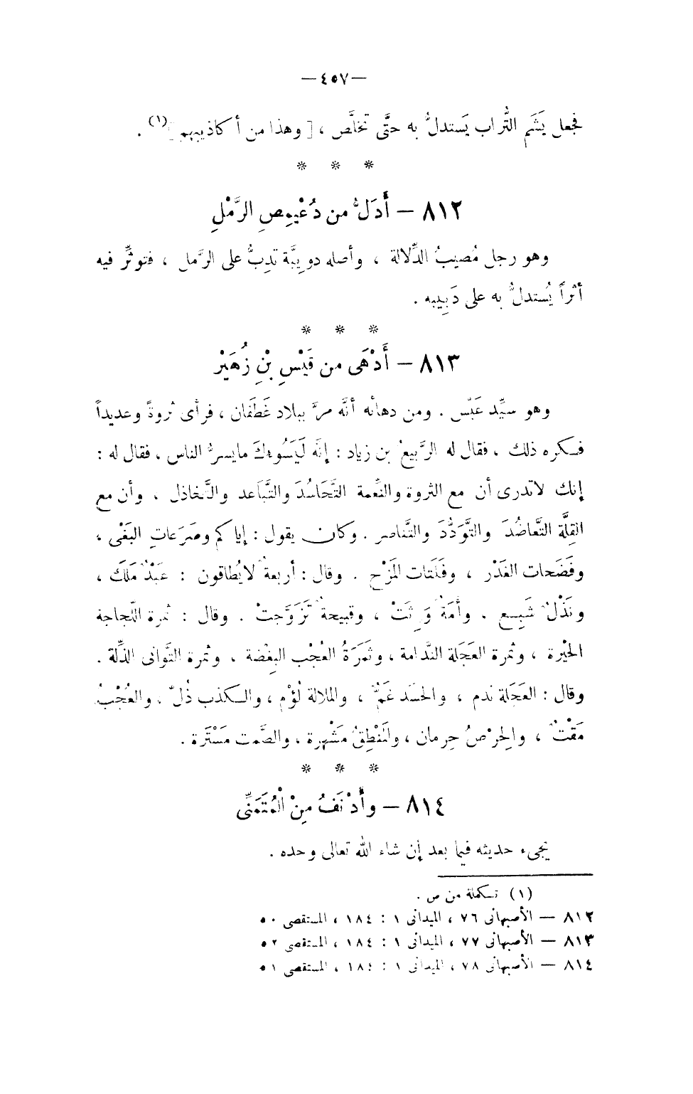 وَمن دهائه أَنه مر بِبِلَاد غطفان فَرَأى ثروةً وعديداً فكره ذَلِك فَقَالَ لَهُ الرّبيع بن زِيَاد إِنَّه ليسوءك مَا يسر النَّاس فَقَالَ لَهُ إِنَّك لَا تَدْرِي أَن مَعَ الثورة وَالنعْمَة التحاسد والتباعد والتخاذل وَأَن مَعَ الْقلَّة التعاضد والتودد والتناصر