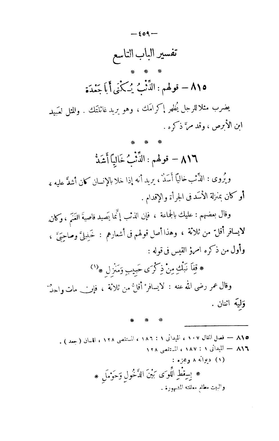 وَقَالَ بَعضهم عَلَيْك بِالْجَمَاعَة فَإِن الذِّئْب إِنَّمَا يصيد قاصية الْغنم وَكَانَ لَا يُسَافر أقل من ثَلَاثَة وَهَذَا أصل قَوْلهم فِي أشعارهم خليلي وصاحبي واول مَا ذكره امْرُؤ الْقَيْس فِي قَوْله