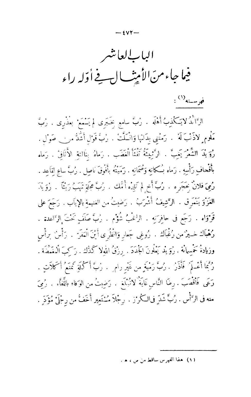 الْبَاب الْعَاشِر فِيمَا جَاءَ من الْأَمْثَال فِي أَوله رَاء