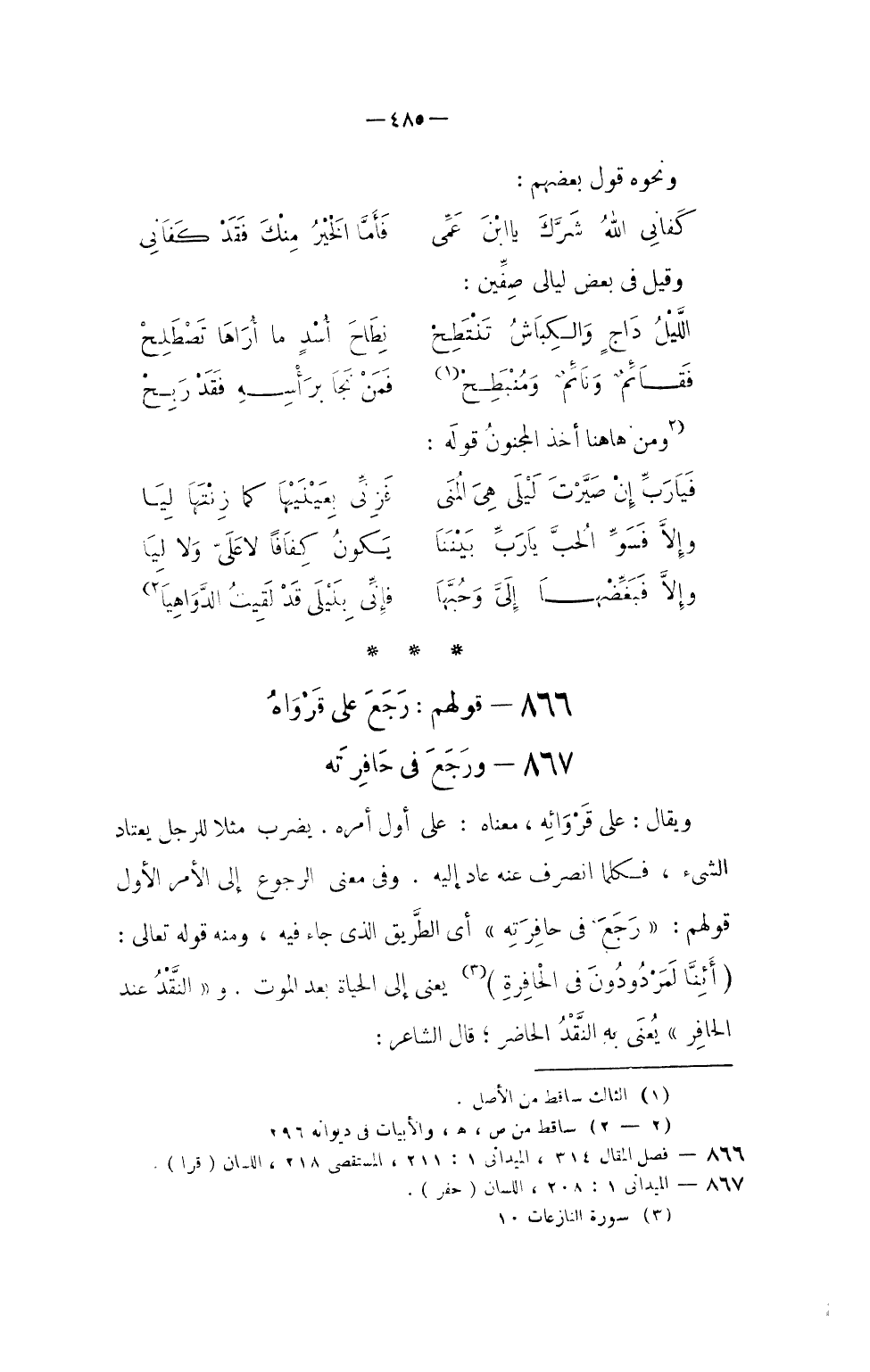 وَفِي معنى الرُّجُوع إِلَى الْأَمر الأول قَوْلهم (رَجَعَ فِي حافرته) أَي الطَّرِيق الَّذِي جَاءَ فِيهِ وَمِنْه قَوْله تَعَالَى