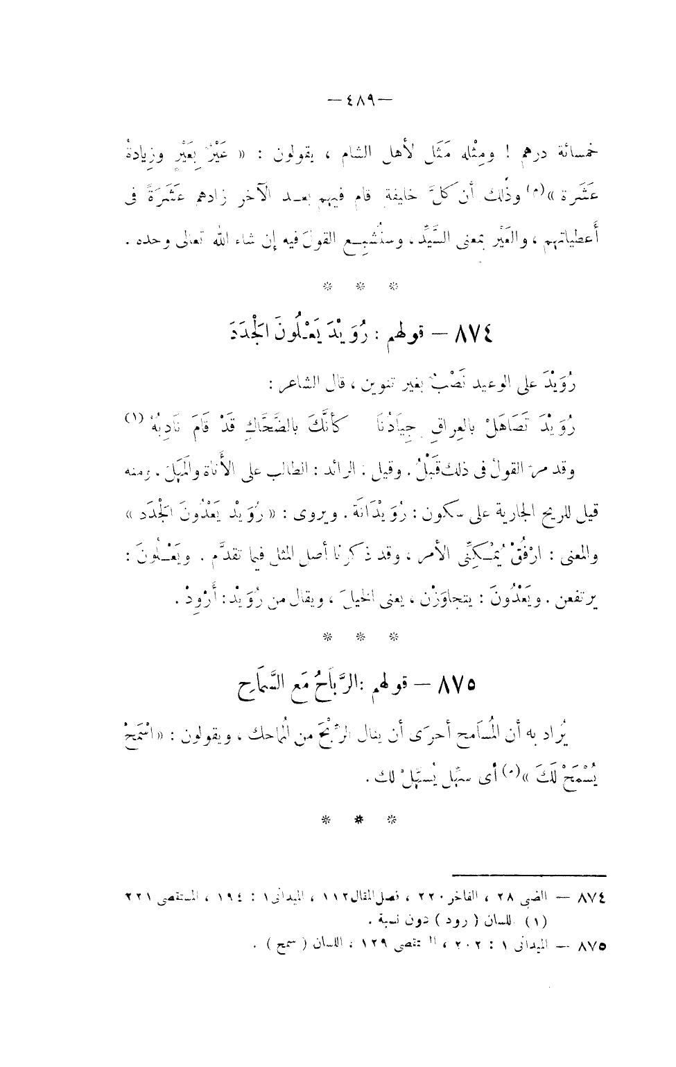 ويروى (رويد يعدون الجدد) وَالْمعْنَى ارْفُقْ يمكني الْأَمر وَقد ذكرنَا أصل الْمثل فِيمَا تقدم
