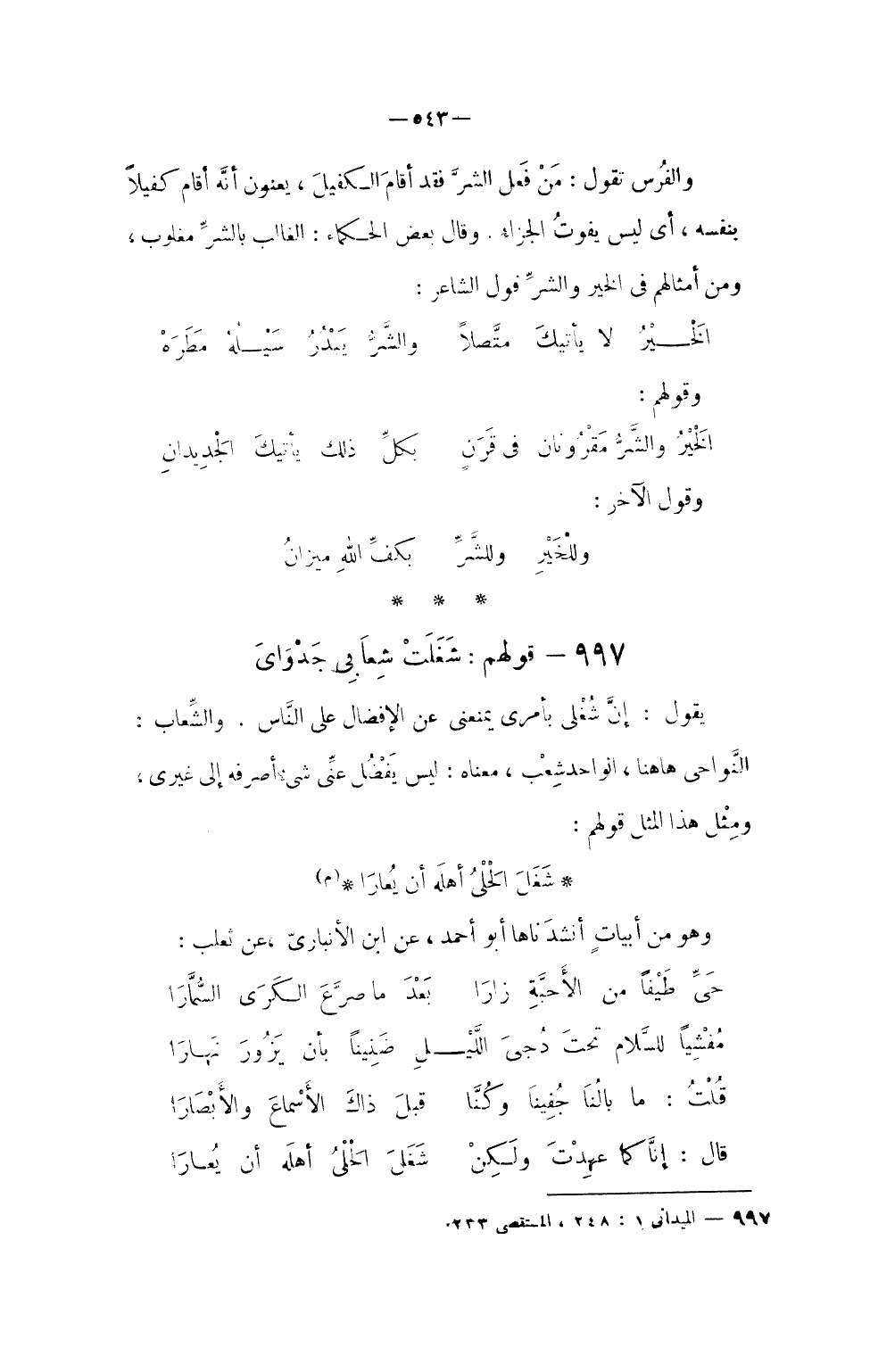 وَقَالَ بعض الْحُكَمَاء الْغَالِب بِالشَّرِّ مغلوب وَمن أمثالهم فِي الْخَيْر وَالشَّر قَول الشَّاعِر