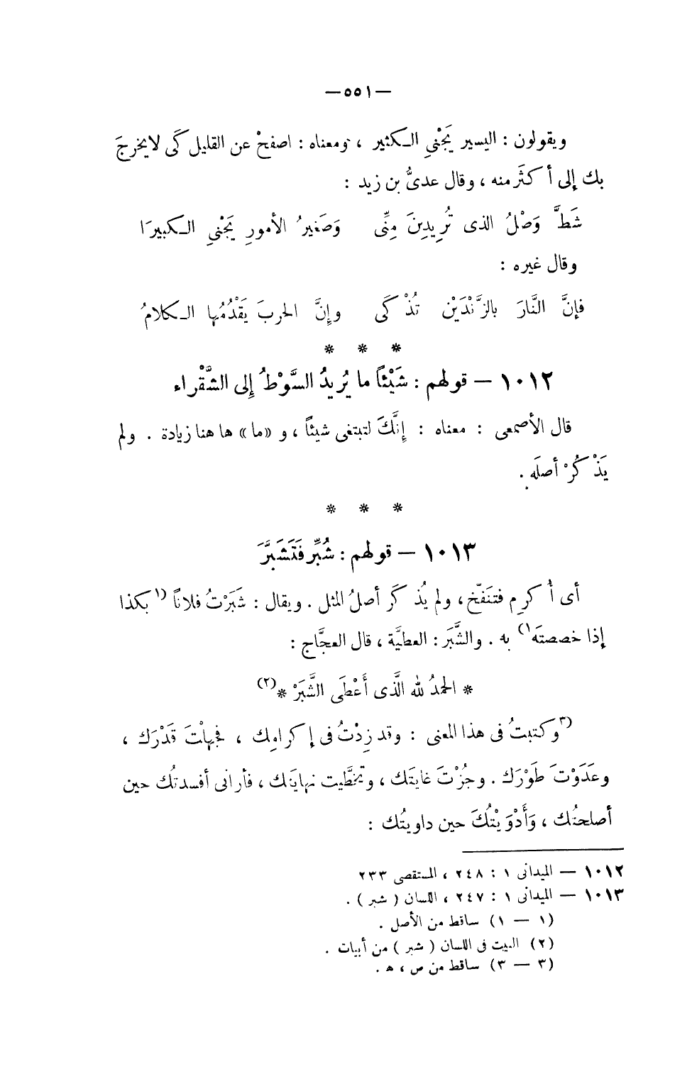 وَيَقُولُونَ الْيَسِير يجني الْكثير وَمَعْنَاهُ اصفح عَن الْقَلِيل كي لَا يخرج بك إِلَى أَكثر مِنْهُ وَقَالَ عدي بن زيد