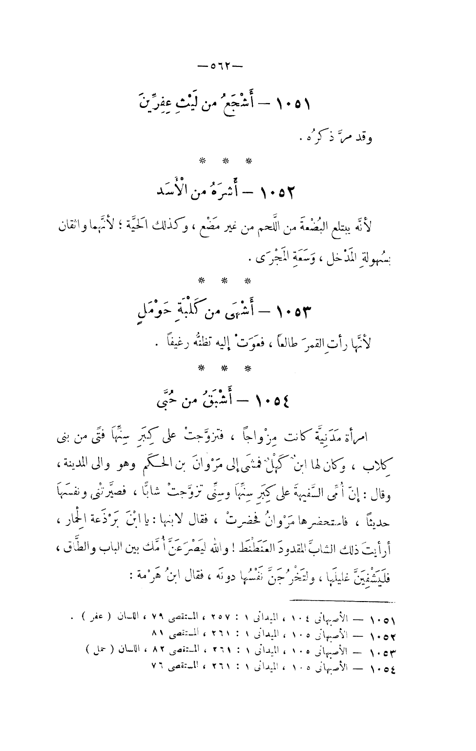 امْرَأَة مَدَنِيَّة كَانَت مزواجاً فَتزوّجت على كبر سنّهَا فَتى من بني كلاب وَكَانَ لَهَا ابْن كهل فَمشى إِلَى مَرْوَان بن الحكم وَهُوَ وَالِي الْمَدِينَة وَقَالَ إِن أُمِّي السفيهة على كبر سنّهَا وسني تزوجت شَابًّا فصيرتني ونفسها حَدِيثا فاستحضرها مَرْوَان فَحَضَرت فَقَالَ لابنها ياابن برذعة الْحمار أَرَأَيْت ذَلِك الشَّاب المقدود العنطنط وَالله ليصرعن أمك بَين الْبَاب والطاق فليشفين غليلها ولتخرجن نَفسهَا دونه فَقَالَ ابْن هرمة