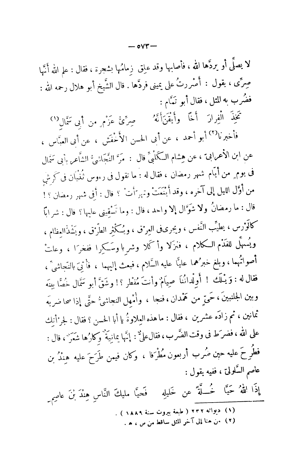 فَأخْبرنَا أبوأحمد عَن أبي الْحسن الْأَخْفَش عَن أبي الْعَبَّاس عَن ابْن الْأَعرَابِي عَن هِشَام الْكَلْبِيّ قَالَ مر النَّجَاشِيّ الشَّاعِر بِأبي سمال فِي يَوْم من أَيَّام شهر رَمَضَان فَقَالَ لَهُ مَا تَقول فِي رُءُوس ثنيان فِي كرش من أول اللَّيْل إِلَى آخِره وَقد أينعت وتهرأت قَالَ أَفِي شهر رَمَضَان قَالَ مَا رَمَضَان وَلَا شَوَّال إِلَّا وَاحِد قَالَ وَمَا تسقيني عَلَيْهَا قَالَ شرابًا كالورس يطيب النَّفس وَيجْرِي فِي الْعرق وَيكثر الطّرق ويشد الْعِظَام ويسهل للفدم الْكَلَام فَنزلَا وأكلا وشربا وسكرا ففخرا وعلت أصواتهما وَبلغ خبرهما عليا عَلَيْهِ السَّلَام فَبعث إِلَيْهِمَا فَأتي بالنجاشي فَقَالَ لَهُ وَيلك أولداننا صِيَام وَأَنت مفطر وشق أَبُو سمال خصاً بَينه وَبَين الجلنبين حَيّ من هَمدَان فنجا وأمهل النَّجَاشِيّ حَتَّى إِذا صَحا ضربه ثَمَانِينَ ثمَّ زَاده عشْرين فَقَالَ مَا هَذِه العلاوة يَا أَبَا الْحسن فَقَالَ لجرأتك على الله فضرط فِي وَقت الضَّرْب فَقَالَ عَليّ إِنَّهَا يَمَانِية وكارها شعر قَالَ فَطرح عَلَيْهِ حِين ضرب أَرْبَعُونَ مطرفاً وَكَانَ فِيمَن طرح عَلَيْهِ هِنْد بن عَاصِم السَّلُولي فَفِيهِ يَقُول