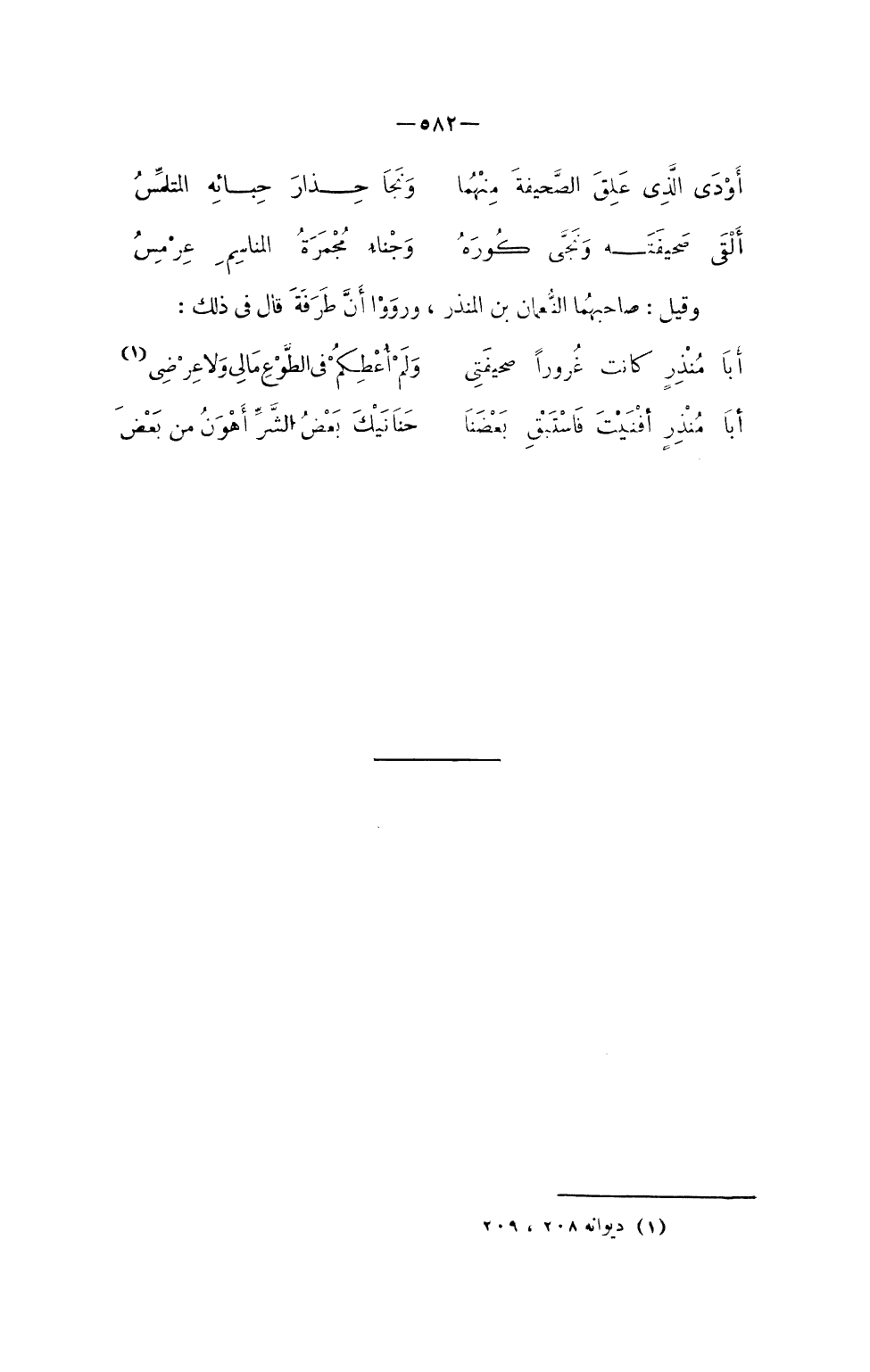 (أَبَا مُنْذر كَانَت غرُورًا صحيفتي ... وَلم أعطكم فِي الطوع مَالِي وَلَا عرضي)