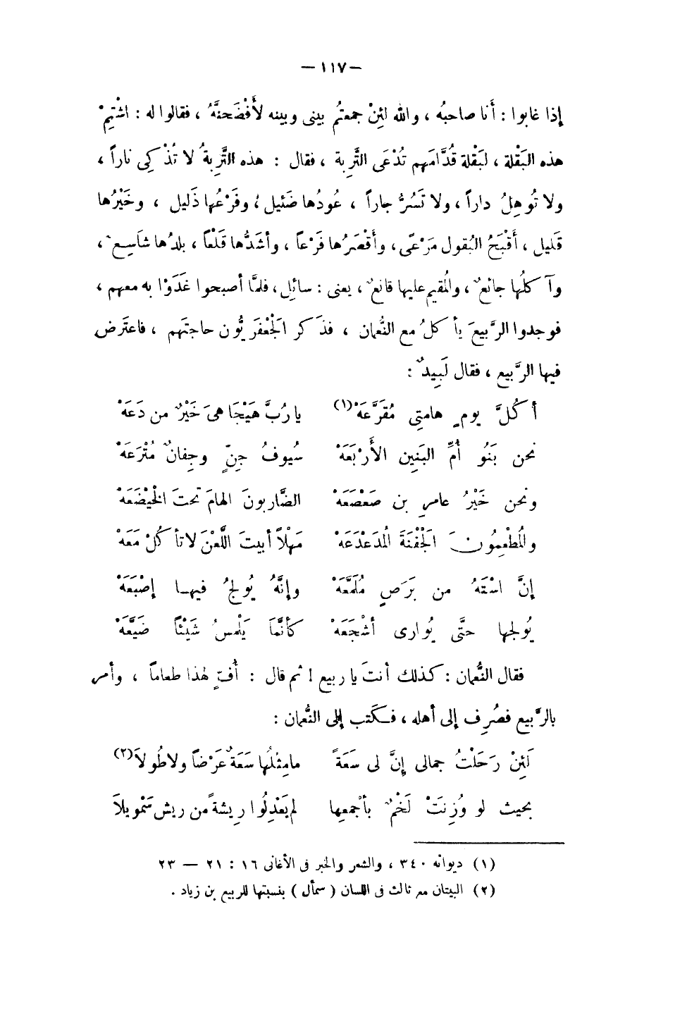 إِذا غَابُوا أَنا صَاحبه وَالله لَئِن جمعتم بيني وَبَينه لأفضحنه فَقَالُوا لَهُ اشتم هَذِه البقلة لبقلة قدامهم تدعى التربة فَقَالَ هَذِه التربة لَا تذكى نَارا وَلَا توهل دَارا وَلَا تسر جاراً عودهَا ضئيل وفرعها ذليل وَخَيرهَا قَلِيل أقبح الْبُقُول مرعىً واقصرها فرعا وأشدها قلعاً بَلَدهَا شاسع وآكلها جائعٌ والمقيم عَلَيْهَا قانعٌ يعْنى سَائل فَلَمَّا أَصْبحُوا غدوا بِهِ مَعَهم فوجدوا الرّبيع يَأْكُل مَعَ النُّعْمَان فَذكر الجعفريون حَاجتهم فَاعْترضَ فِيهَا الرّبيع فَقَالَ لبيدٌ