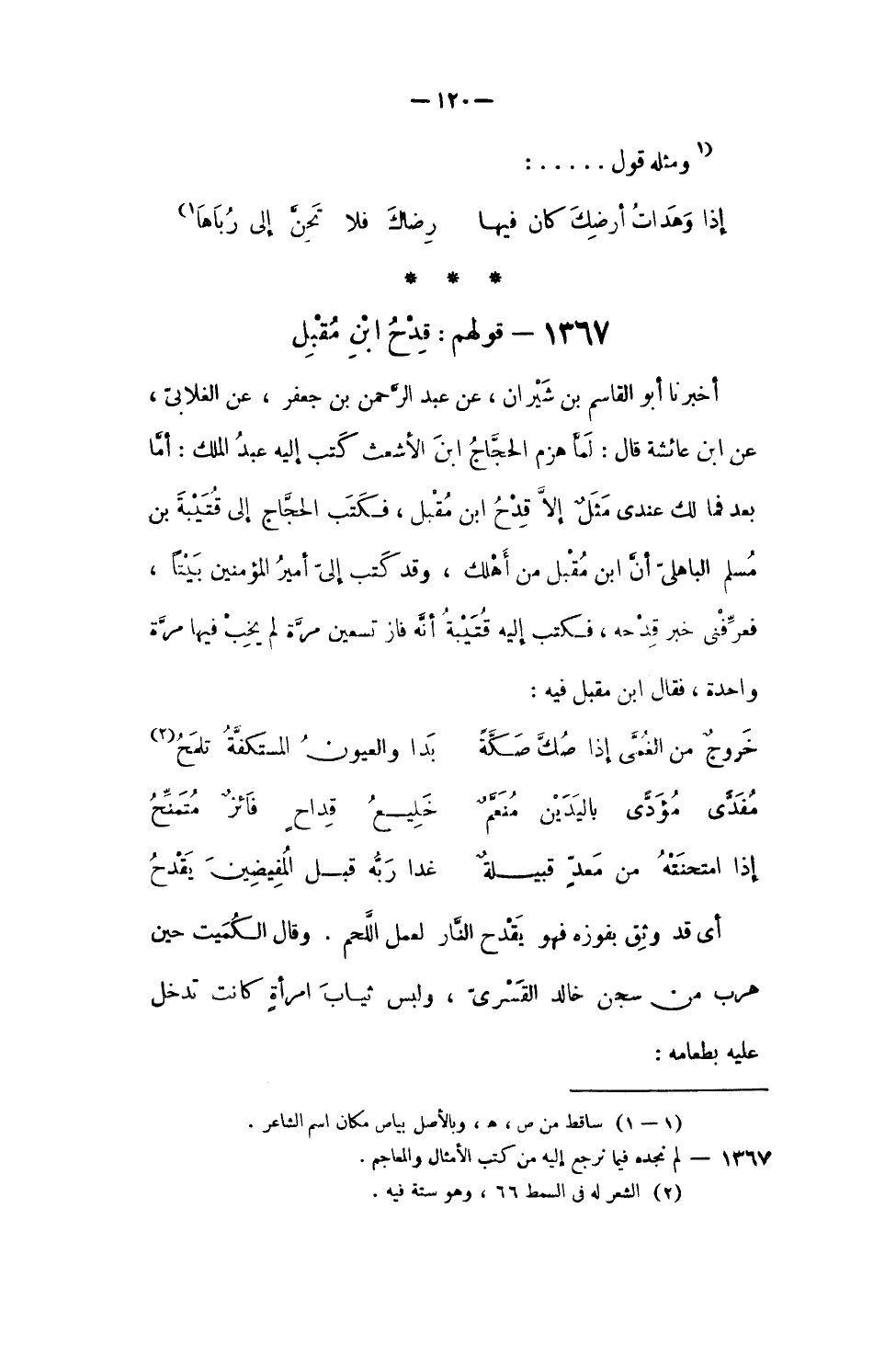 أخبرنَا أَبُو الْقَاسِم بن شيران عَن عبد الرَّحْمَن بن جَعْفَر عَن الغلابى عَن ابْن عَائِشَة قَالَ لما هزم الْحجَّاج ابْن الْأَشْعَث كتب إِلَيْهِ عبد الْملك أما بعد فَمَا لَك عندى مثلٌ إِلَّا قدح ابْن مقبل فَكتب الْحجَّاج إِلَى قُتَيْبَة بن مُسلم الباهلى أَن ابْن مقبل من أهلك وَقد كتب إِلَى أَمِير الْمُؤمنِينَ بَيْتا فعرفنى خبر قدحه فَكتب إِلَيْهِ قُتَيْبَة أَنه فَازَ تسعين مرّة لم يخب فِيهَا مرّة وَاحِدَة فَقَالَ ابْن مقبل فِيهِ