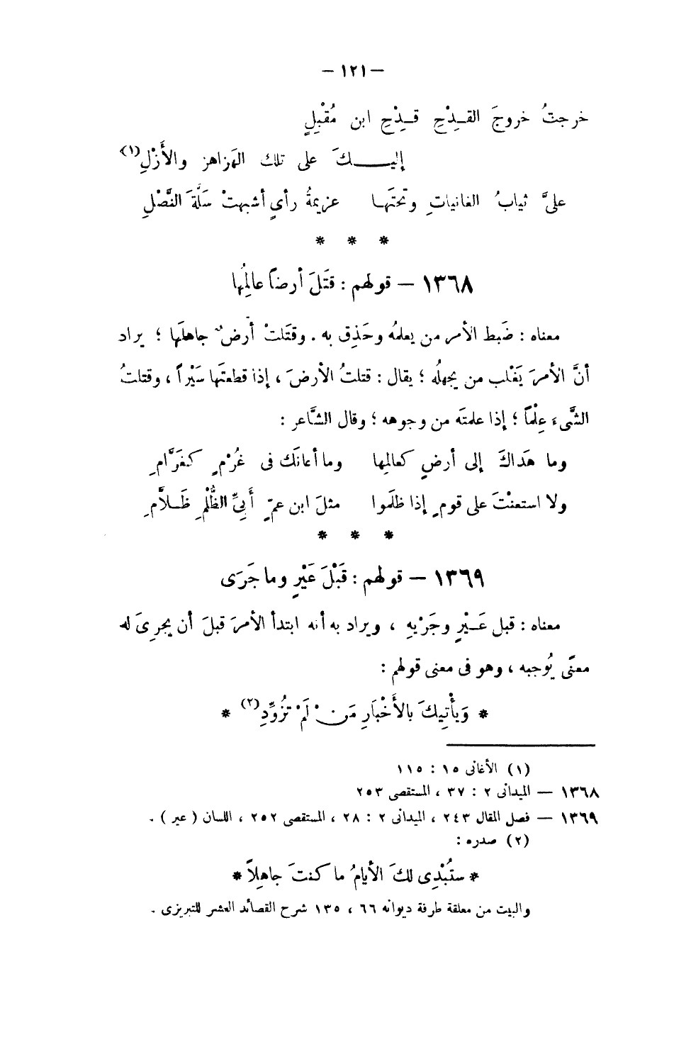 (خرجت خُرُوج الْقدح قدح ابْن مقبلٍ ... إِلَيْك على تِلْكَ الهزاهز وَالْأَزَلُ)