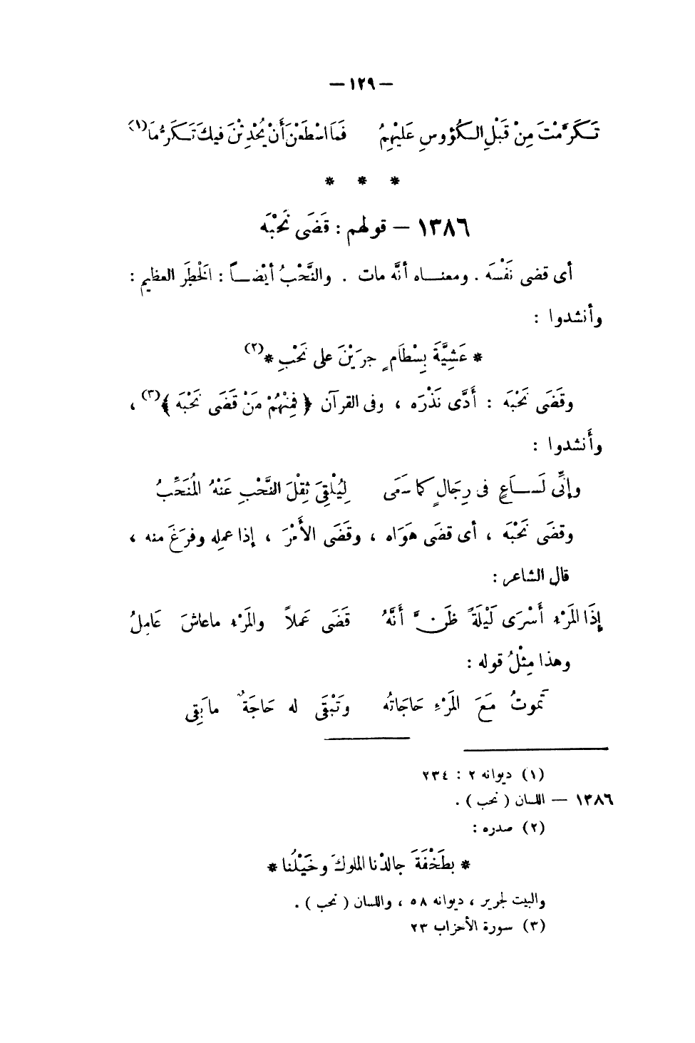 وَقضى نحبه أدّى نَذره وَفِي الْقُرْآن {فَمنهمْ من قضى نحبه} وأنشدوا