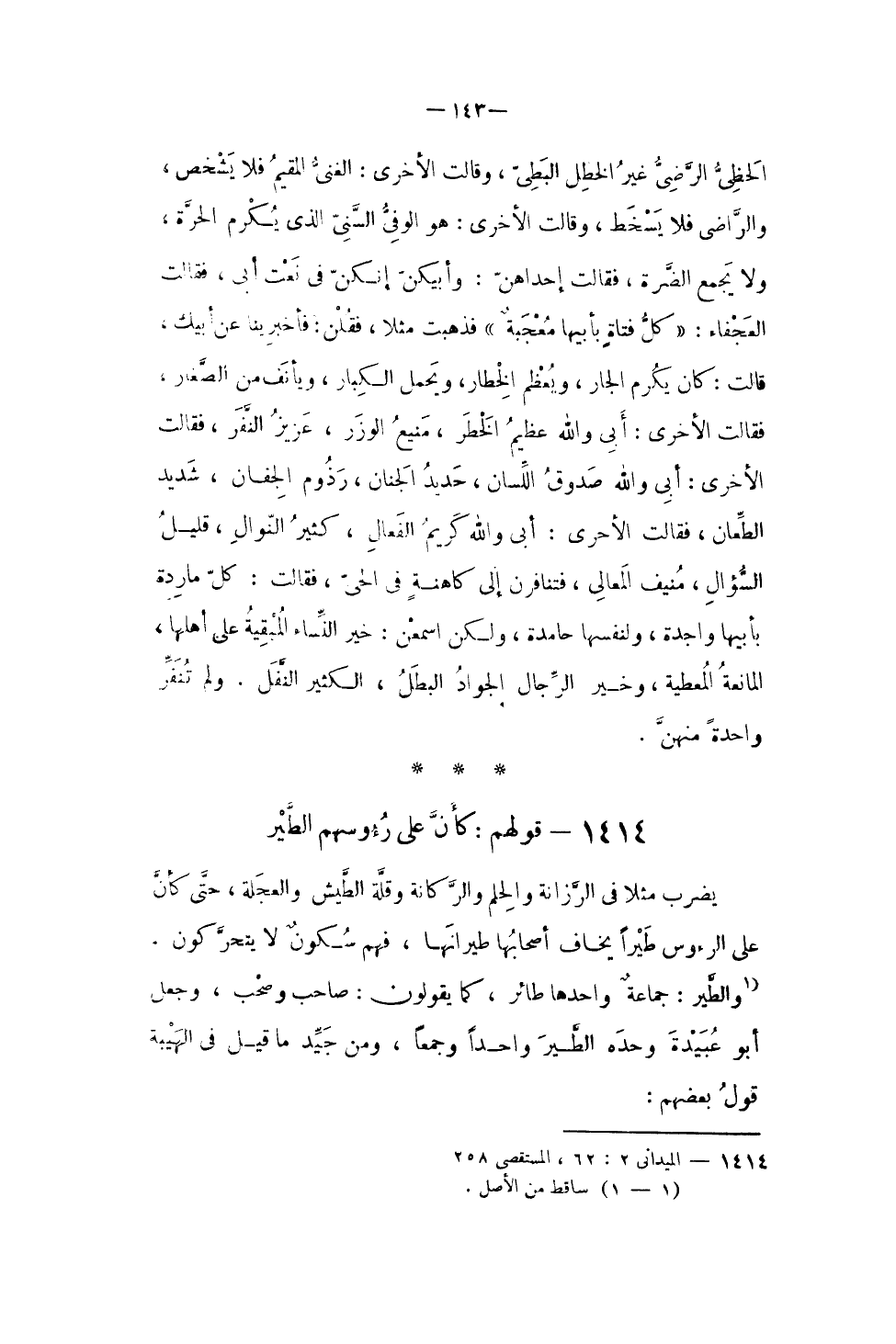 الحظى الرضى غير الخطل البطى وَقَالَت الْأُخْرَى الْغنى الْمُقِيم فَلَا يشخص والراضى فَلَا يسْخط وَقَالَت الْأُخْرَى هُوَ الوفى السنى الَّذِي يكرم الْحرَّة وَلَا يجمع الضرة فَقَالَت إِحْدَاهُنَّ وأبيكن إنكن فِي نعت أَبى فَقَالَت الْعَجْفَاء كل فتاةٍ بأبيها معجبةٌ فَذَهَبت مثلا فَقُلْنَ فأخبرينا عَن أَبِيك قَالَت كَانَ يكرم الْجَار ويعظم الخطار وَيحمل الْكِبَار ويأنف من الصغار فَقَالَت الْأُخْرَى أَبى وَالله عَظِيم الْخطر منيع الْوزر عَزِيز النَّفر فَقَالَت الأخرة أَبى وَالله صَدُوق اللِّسَان حَدِيد الْجنان رذوم الجفان شَدِيد الطعان فَقَالَت الْأُخْرَى أَبى وَالله كريم الفعال كثير النوال قَلِيل السُّؤَال منيف المعالى فتنافرن إِلَى كاهنةٍ فِي الحى فَقَالَت كل ماردة بأبيها واجدة ولنفسها حامدة وَلَكِن اسمعن خير النِّسَاء المبقية على أَهلهَا الْمَانِعَة المعطية وَخير الرِّجَال الْجواد البطل الْكثير النَّفْل وَلم تنفر وَاحِدَة مِنْهُنَّ
