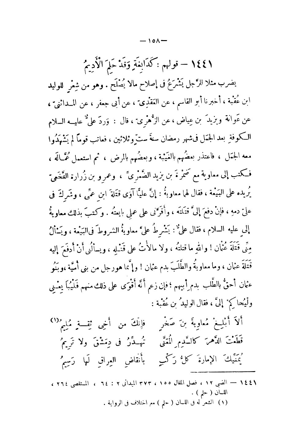 وَهُوَ من شعرٍ للوليد ابْن عقبَة أخبرنَا أَبُو الْقَاسِم عَن الْعَقدي عَن أبي جَعْفَر عَن المدائنى عَن عوَانَة وَيزِيد بن عِيَاض عَن الزُّهْرِيّ قَالَ ورد عَليّ صلى الله عَلَيْهِ وَسلم الْكُوفَة بعد الْجمل فِي شهر رَمَضَان سنة ستٍ وَثَلَاثِينَ فعاتب قوما لم يشْهدُوا مَعَه الْجمل فَاعْتَذر بَعضهم بالغيبة وَبَعْضهمْ بِالْمرضِ ثمَّ اسْتعْمل عماله فَكتب إِلَى مُعَاوِيَة مَعَ ضَمرَة بن يزِيد الضمرى وَعَمْرو بن زُرَارَة النخعى يُريدهُ على الْبيعَة فَقَالَ لَهما مُعَاوِيَة إِن عليا آوى قتلة ابْن عمى وشرك فِي على دَمه فَإِن دفع إِلَى قتلته وأقرنى على عملى بايعته وَكتب بذلك مُعَاوِيَة إِلَى صلى الله عَلَيْهِ وَسلم فَقَالَ علىٌ يشرط على مُعَاوِيَة الشُّرُوط فِي الْبيعَة وَيسْأل منى قتلة عُثْمَان وَالله مَا قتلته وَلَا مالأت على قَتله ويسألنى أَن أدفَع إِلَيْهِ قتلة عُثْمَان وَمَا مُعَاوِيَة والطلب بِدَم عُثْمَان وَإِنَّمَا هُوَ رجل من بنى أُميَّة وَبَنُو عُثْمَان أَحَق بِالطَّلَبِ بِدَم أَبِيهِم فَإِن زعم أَنه أقوى على ذَلِك مِنْهُم فليبا يعْنى وليحاكم إِلَى فَقَالَ الْوَلِيد بن عقبَة
