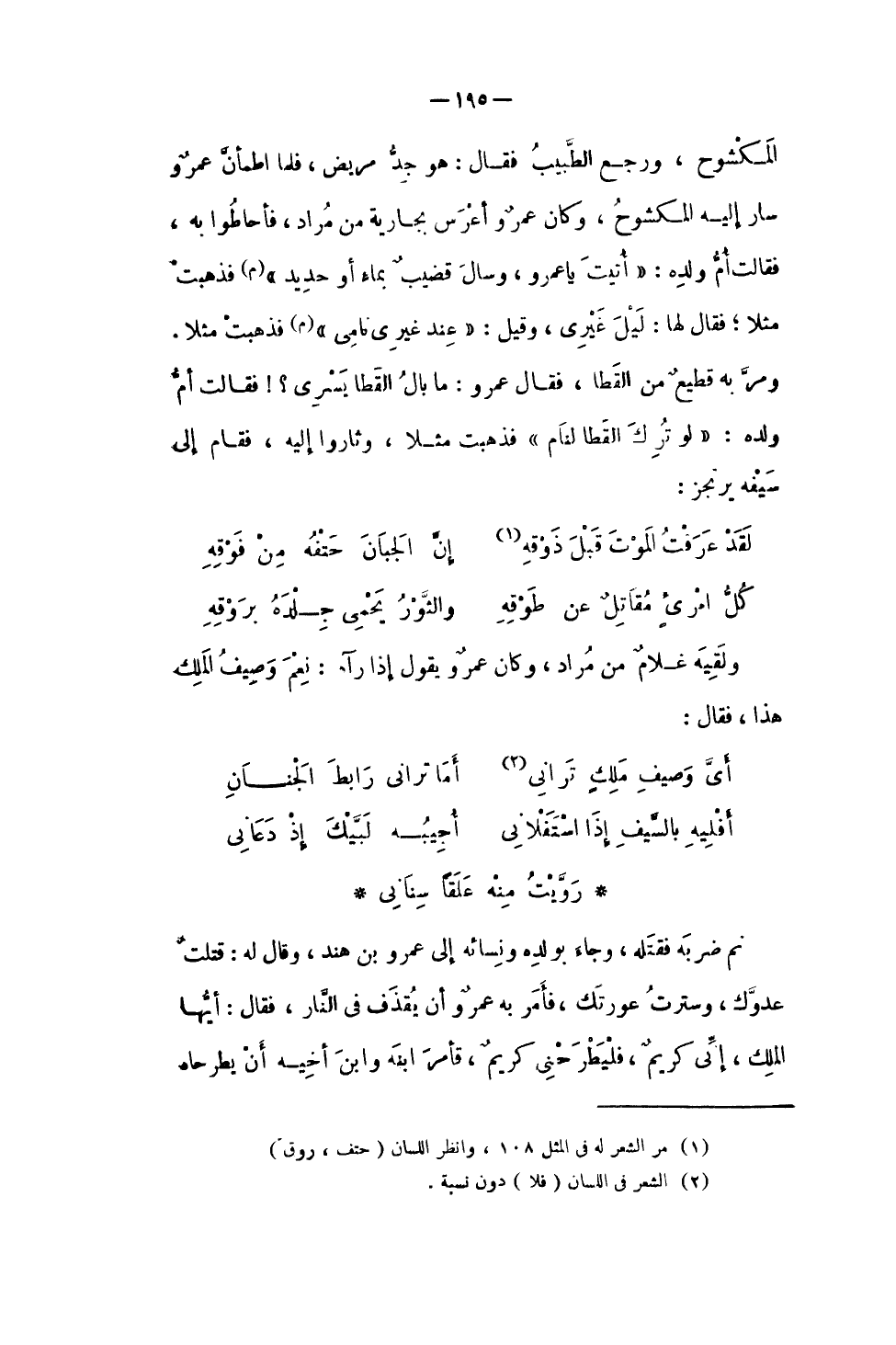 المكشوح وَرجع الطَّبِيب فَقَالَ هُوَ جد مَرِيض فَلَمَّا اطْمَأَن عمرٌو سَار إِلَيْهِ المكشوح وَكَانَ عَمْرو أعرس بِجَارِيَة من مُرَاد فأحاطوا بِهِ فَقَالَت أم وَلَده أتيت يَا عَمْرو وسال قضيبٌ بِمَاء أَو حَدِيد فَذَهَبت مثلا فَقَالَ لَهَا ليل غيرى وَقيل عِنْد غيرى نامى فَذَهَبت مثلا