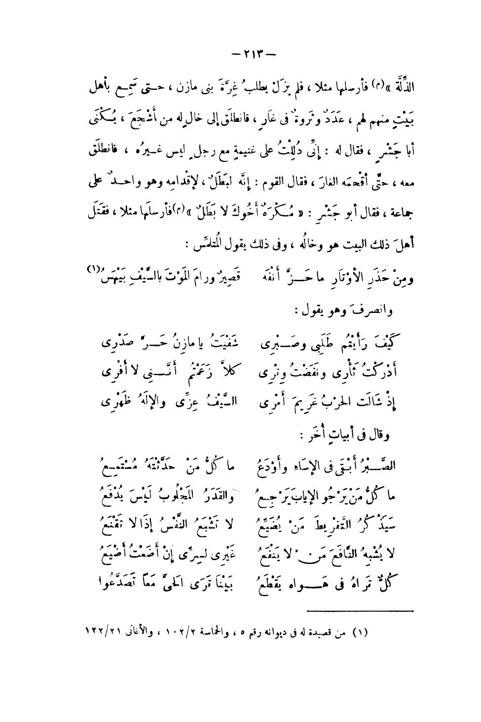 الذلة فأرسلها مثلا فَلم يزل يطْلب غرَّة بنى مَازِن حَتَّى سمع بِأَهْل بيتٍ مِنْهُم لَهُم عددٌ وثروةٌ فِي غارٍ فَانْطَلق إِلَى خالٍ لَهُ من أَشْجَع يكنى أَبَا جشرٍ فَقَالَ لَهُ إنى دللت على غنيمةٍ مَعَ رجلٍ لَيْسَ غَيره فَانْطَلق مَعَه حَتَّى أقحمه الْغَار فَقَالَ الْقَوْم إِنَّه لبطلٌ لإقدامه وَهُوَ واحدٌ على جمَاعَة فَقَالَ أَبُو جشر مكرهٌ أَخُوك لَا بَطل فأرسلها مثلا فَقتل أهل ذَلِك الْبَيْت هُوَ وخاله وَفِي ذَلِك يَقُول المتلمس
