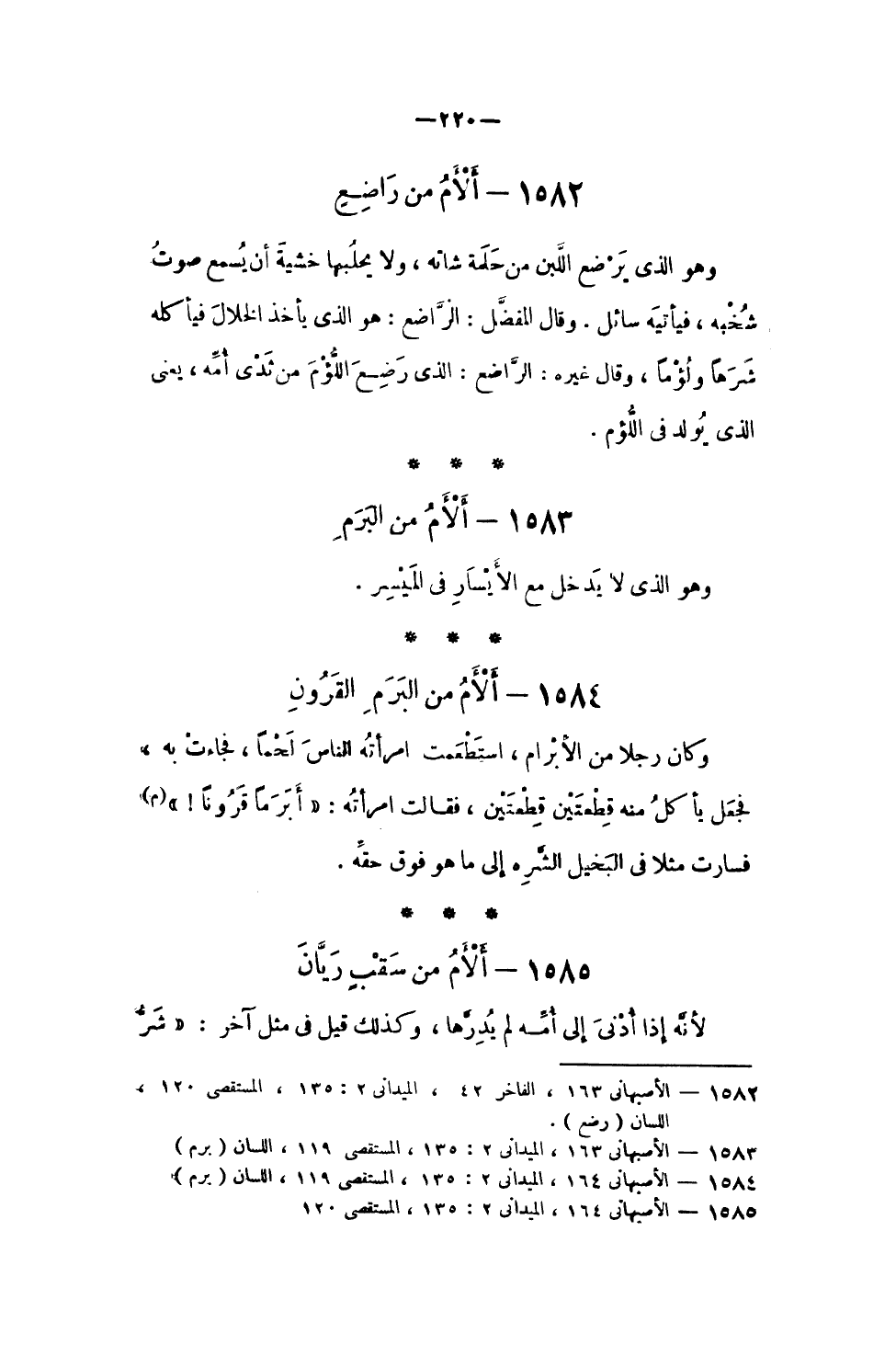 وَكَانَ رجلا من الأبرام استطعمت امْرَأَته النَّاس لَحْمًا فَجَاءَت بِهِ فَجعل يَأْكُل مِنْهُ قطعتين قطعتين فَقَالَت امْرَأَته أبرماً قروناً فسارت مثلا فِي الْبَخِيل الشره إِلَى مَا هُوَ فَوق حَقه