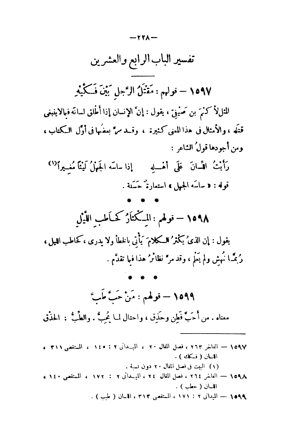 يَقُول إِن الَّذِي يكثر الْكَلَام يأتى بالْخَطَأ وَلَا يدرى كحاطب اللَّيْل رُبمَا نهش وَلم يعلم وَقد مر نَظَائِر هَذَا فِيمَا تقدم