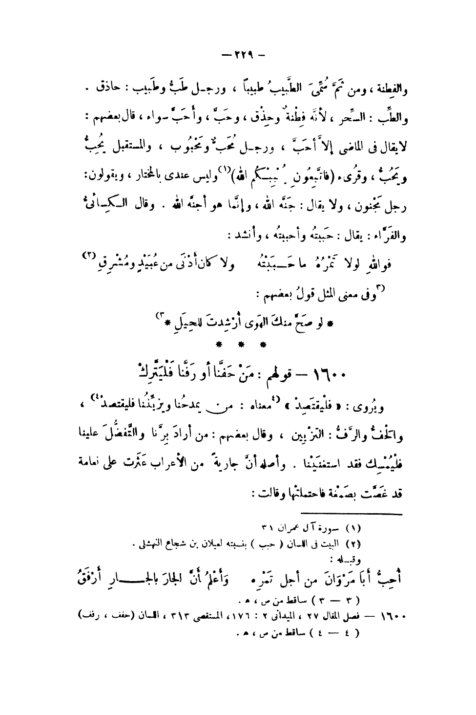 والطب السحر لِأَنَّهُ فطنةٌ وحذق وَحب وَأحب سَوَاء قَالَ بَعضهم لَا يُقَال فِي الماضى إِلَّا أحب وَرجل محبٌ ومحبوب والمستقبل يحب وَيُحب وَقُرِئَ {فَاتبعُوني يحببكم الله} وَلَيْسَ عندى بالمختار وَيَقُولُونَ رجل مَجْنُون وَلَا يُقَال جنه الله وَإِنَّمَا هُوَ أجنه الله