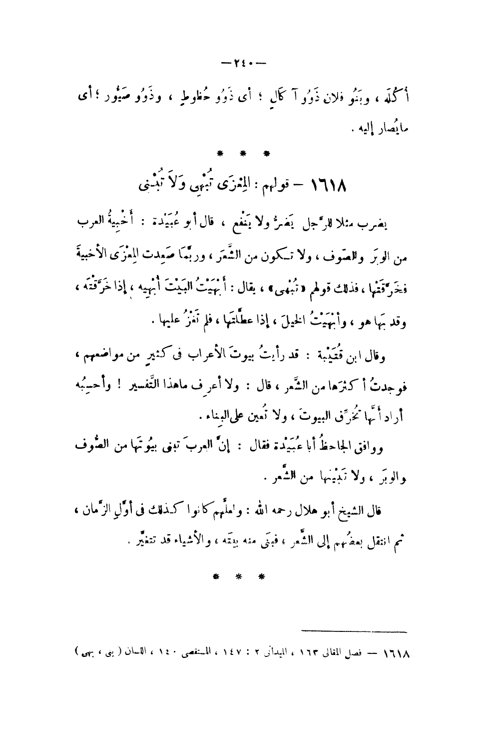 وَوَافَقَ الجاحظ أَبَا عُبَيْدَة فَقَالَ إِن الْعَرَب تبنى بيوتها من الصُّوف والوبر وَلَا تبنيها من الشّعْر