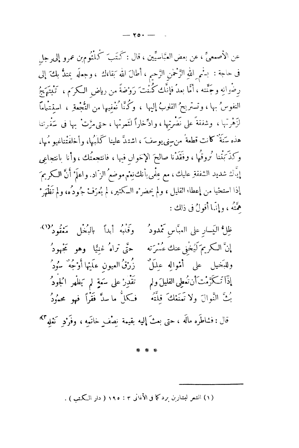 عَن الأصمعى عَن بعض العباسيين قَالَ كتب كُلْثُوم بن عَمْرو إِلَى رجلٍ فِي حَاجَة بِسم الله الرَّحْمَن الرَّحِيم أَطَالَ الله بَقَاءَك وَجعله يَمْتَد بك إِلَى رضوانه وجنته أما بعد فَإنَّك كنت رَوْضَة من رياض الْكَرم تبتهج النُّفُوس بهَا وتستريح الْقُلُوب إِلَيْهَا وَكُنَّا نعفيها من النجعة استتماماً لزهرتها وشفقةً على نضرتها وادخاراً لثمرتها حَتَّى مرت بهَا فِي سفرتنا هَذِه سنةٌ كَانَت قِطْعَة من سنى يُوسُف اشْتَدَّ علينا كلبها وأخلفتنا غيومها وكذبتنا بروقها وفقدنا صَالح الإخوان فِيهَا فانتجعتك وَأَنا بانتجاعى إياك شَدِيد الشَّفَقَة عَلَيْك مَعَ علمى بأنك نعم مَوضِع الزَّاد
