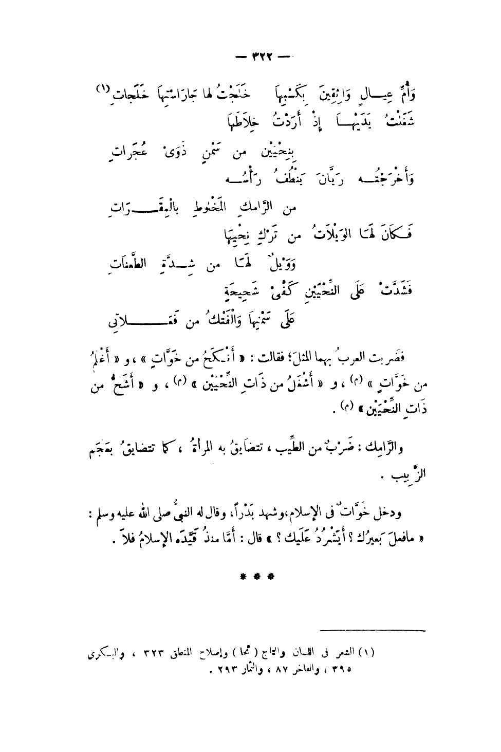 فَضربت الْعَرَب بهما الْمثل فَقَالَت أنكح من خَوات وأغلم من خَوات وأشغل من ذَات النحيين وأشح من ذَات النحيين