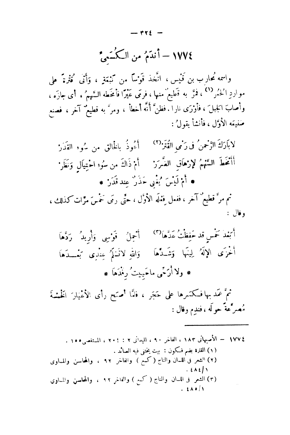 واسْمه محَارب بن قيس اتخذ قوساً من نبعةٍ وأتى قترةً على موارد الْحمر فَمر بِهِ قطيعٌ مِنْهَا فَرمى عيرًا فأمخطه السهْم أَي جازه وَأصَاب الْجَبَل فأورى نَارا فَظن أَنه أَخطَأ وَمر بِهِ قطيعٌ آخر فَصنعَ صَنِيعه الأول فَأَنْشَأَ يَقُول