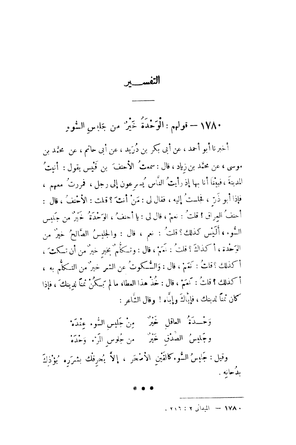 أخبرنَا أَبُو أَحْمد عَن أبي بكر بن دُرَيْد عَن أَبى حَاتِم عَن مُحَمَّد بن مُوسَى عَن مُحَمَّد بن زِيَاد قَالَ سَمِعت الْأَحْنَف بن قيس يَقُول أتيت الْمَدِينَة فَبينا أَنا بهَا إِذْ رَأَيْت النَّاس يسرعون إِلَى رجل فمررت مَعَهم فَإِذا أَبُو ذرٍ فَجَلَست إِلَيْهِ فَقَالَ لي من أَنْت قلت الْأَحْنَف قَالَ أحنف الْعرَاق قلت نعم قَالَ لي يَا أحنف الْوحدَة خيرٌ من جليس السوء أَلَيْسَ كَذَلِك قلت نعم قَالَ والجليس الصَّالح خيرٌ من الْوحدَة أكذاك قلت نعم قَالَ وتكلمٌ بخيرٍ خيرٌ من أَن تسكت أَكَذَلِك قلت نعم قَالَ وَالسُّكُوت عَن الشَّرّ خيرٌ من التَّكَلُّم بِهِ أَكَذَلِك قلت نعم قَالَ خُذ هَذَا الْعَطاء مَا لم يكن ثمنا لدينك فَإِذا كَانَ ثمنا لدينك فإياك وإياه وَقَالَ الشَّاعِر
