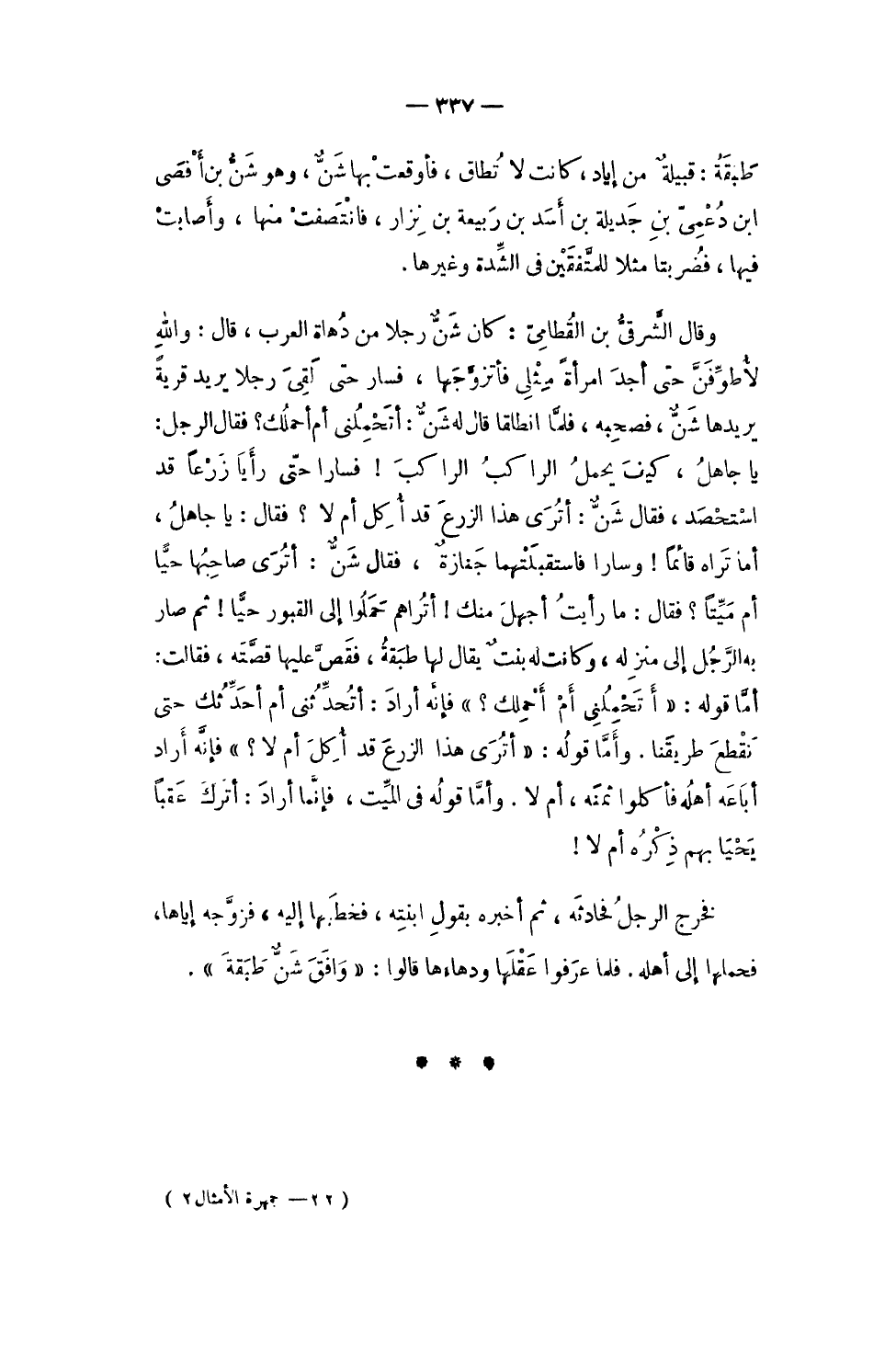 وَقَالَ الشرقى بن القطامى كَانَ شنٌ رجلا من دهاة الْعَرَب قَالَ وَالله لأطوفن حَتَّى أجد امْرَأَة مثلى فأتزوجها فَسَار حَتَّى لقى رجلا يُرِيد قَرْيَة يريدها شنٌ فصحبه فَلَمَّا انْطَلقَا قَالَ لَهُ شنٌ أتحملنى أم أحملك فَقَالَ الرجل يَا جَاهِل كَيفَ يحمل الرَّاكِب الرَّاكِب فسارا حَتَّى رَأيا زرعا قد استحصد فَقَالَ شنٌ أَتَرَى هَذَا الزَّرْع قد أكل أم لَا فَقَالَ يَا جَاهِل أما ترَاهُ قَائِما وسارا فاستقبلتهما جنازةٌ فَقَالَ شنٌ أَتَرَى صَاحبهَا حَيا أم مَيتا فَقَالَ مَا رَأَيْت أَجْهَل مِنْك أَترَاهُم حملُوا إِلَى الْقُبُور حَيا ثمَّ صَار بِهِ الرجل إِلَى منزله وَكَانَت لَهُ بنتٌ يُقَال لَهَا طبقَة فَقص عَلَيْهَا قصَّته فَقَالَت أما قَوْله أتحملنى أم أحملك فَإِنَّهُ أَرَادَ أتحدثنى أم أحَدثك حَتَّى نقطع طريقنا