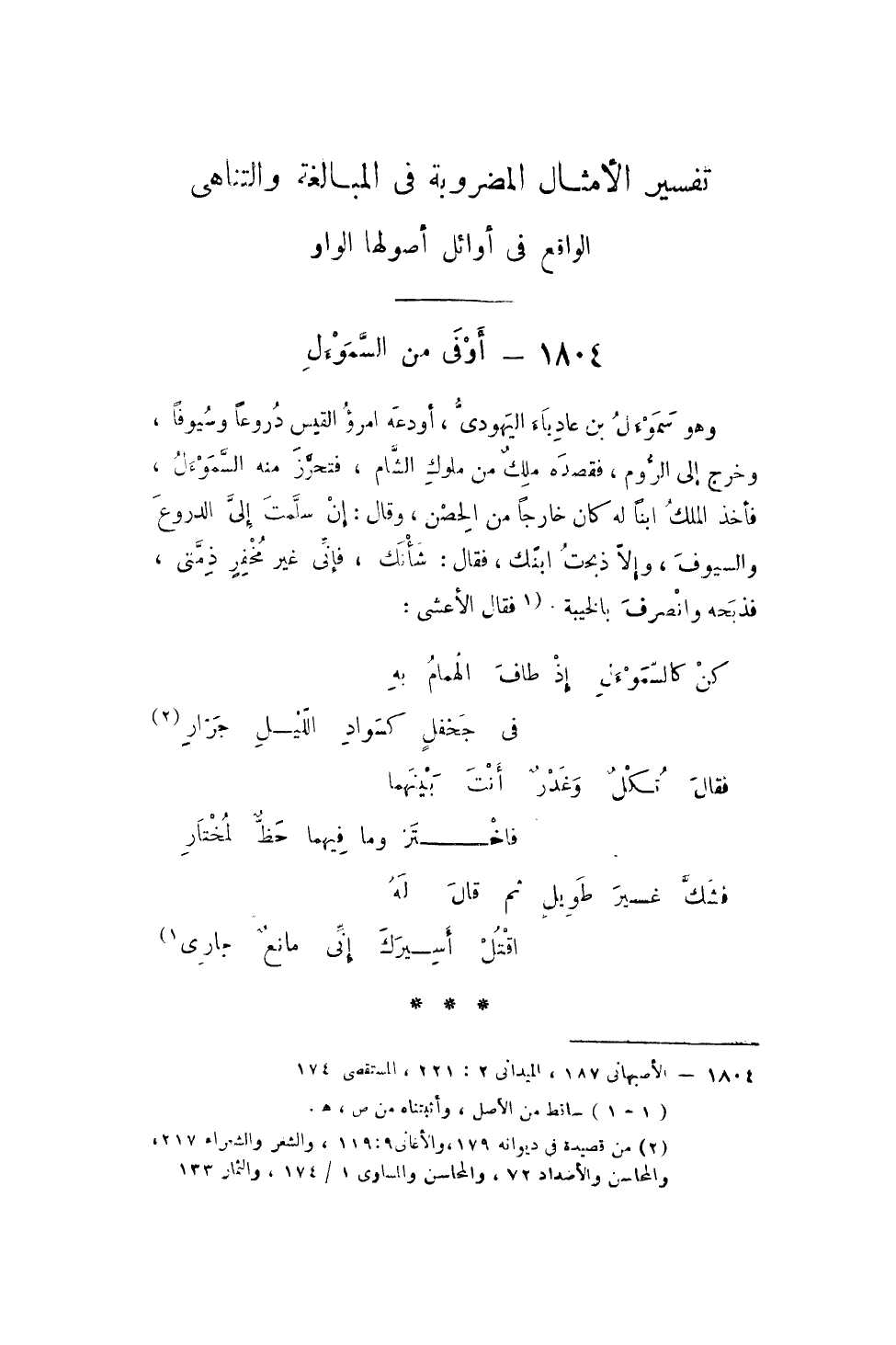 وَهُوَ سموءل بن عادياء اليهودى أودعهُ امْرُؤ الْقَيْس دروعاً وسيوفاً وَخرج إِلَى الرّوم فقصده ملكٌ من مُلُوك الشَّام فتحرز مِنْهُ السموءل فَأخذ الْملك ابْنا لَهُ كَانَ خَارِجا من الْحصن وَقَالَ إِن سلمت إِلَى الدروع وَالسُّيُوف وَإِلَّا ذبحت ابْنك فَقَالَ شَأْنك فإنى غير مخفرٍ ذمتى فذبحه وَانْصَرف بالخيبة فَقَالَ الْأَعْشَى