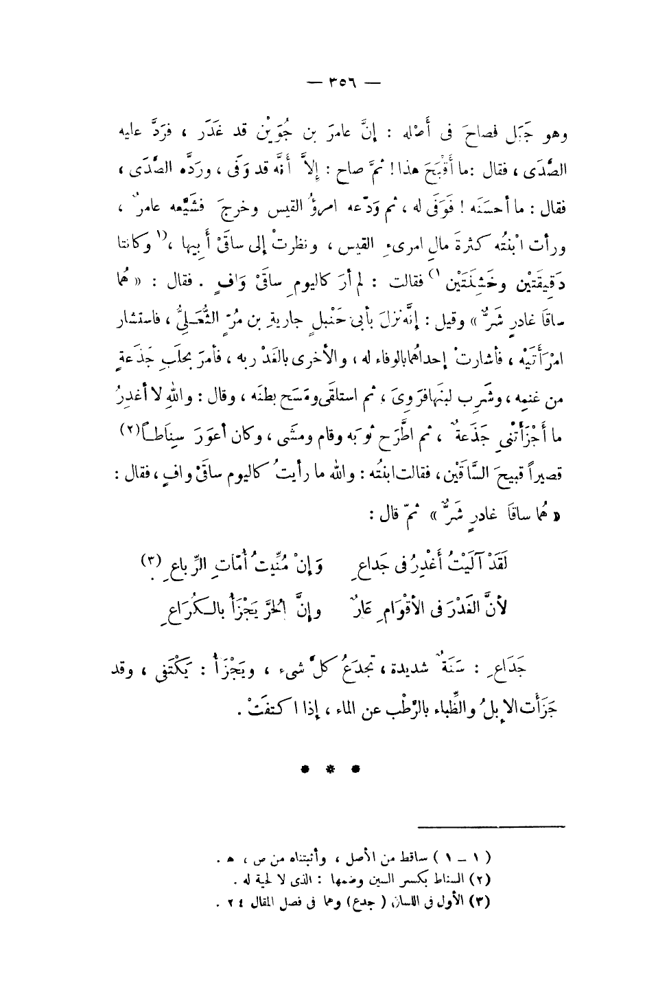 فَقَالَ هما ساقا غادرٍ شرٌ وَقيل إِنَّه نزل بأبى حنبلٍ جَارِيَة بن مرٍ الثعلى فَاسْتَشَارَ امرأتيه فَأَشَارَتْ إِحْدَاهمَا بِالْوَفَاءِ لَهُ وَالْأُخْرَى بالغدر بِهِ فَأمر بحلب جذعةٍ من غنمه وَشرب لَبنهَا فروى ثمَّ اسْتلْقى وَمسح بَطْنه وَقَالَ وَالله لَا أغدر مَا أجزأتنى جذعةٌ ثمَّ اطرَح ثَوْبه وَقَامَ وَمَشى وَكَانَ أَعور سناطاً قَصِيرا قَبِيح السَّاقَيْن فَقَالَت ابْنَته وَالله مَا رَأَيْت كَالْيَوْمِ ساقى وافٍ فَقَالَ هما ساقا غادرٍ شرٌ ثمَّ قَالَ