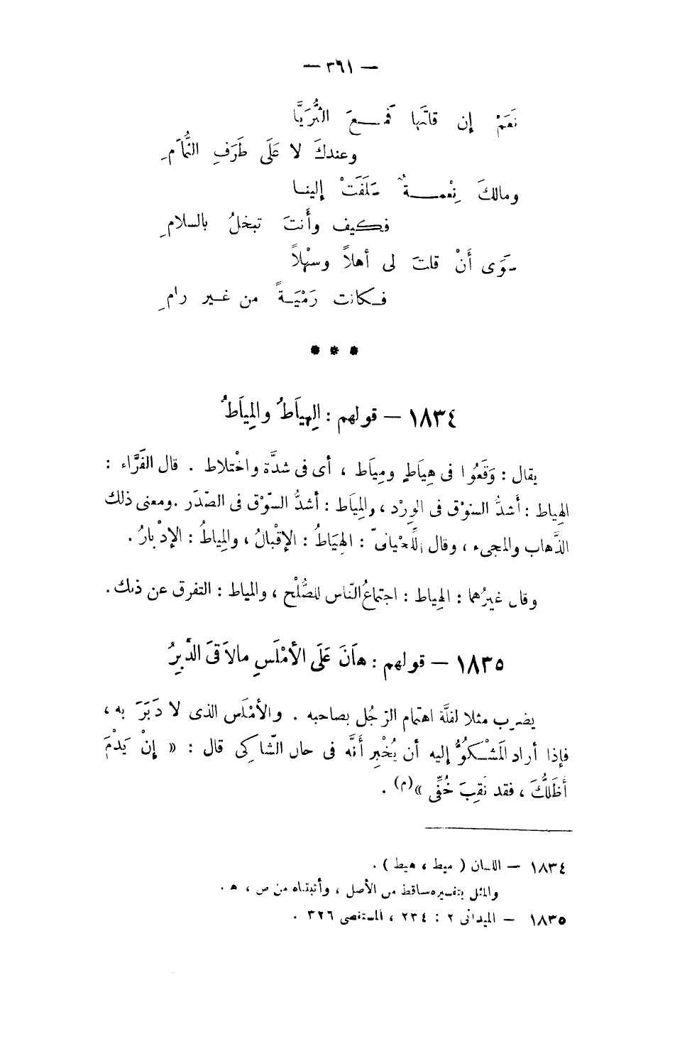 وَمعنى ذَلِك الذّهاب والمجئ وَقَالَ اللحيانى الهياط الإقبال والمياط الإدبار