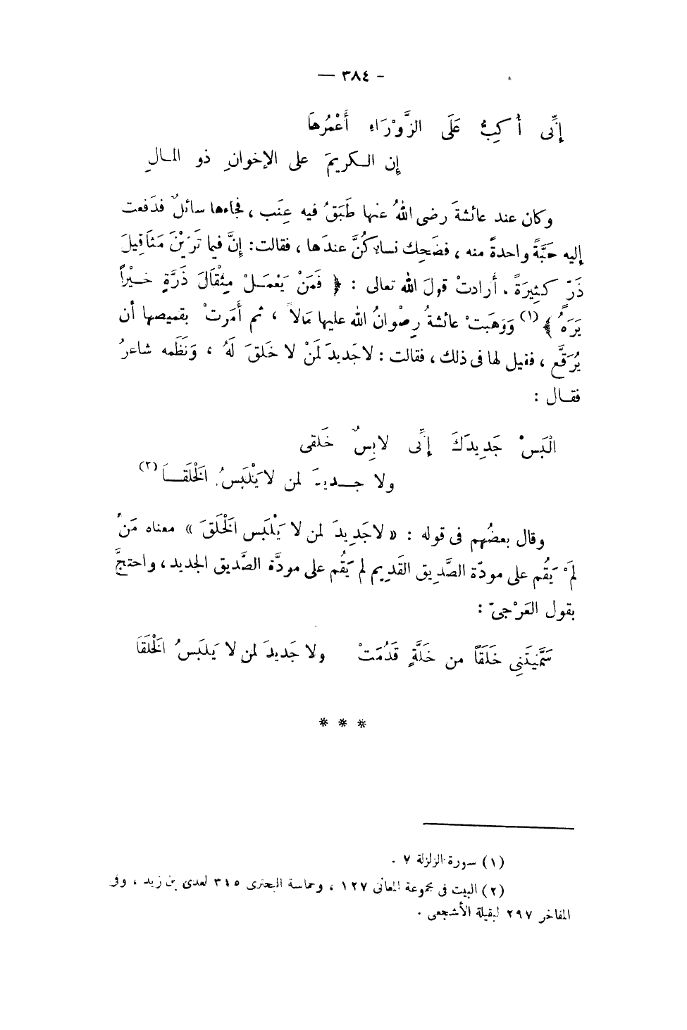 أَرَادَت قَول الله تَعَالَى {فَمن يعْمل مِثْقَال ذرةٍ خيرا يره} ووهبت عَائِشَة رضوَان الله عَلَيْهَا مَالا ثمَّ أمرت بقميصها أَن يرقع فَقيل لَهَا فِي ذَلِك فَقَالَت لَا جَدِيد لمن لَا خلق لَهُ ونظمه شاعرٌ فَقَالَ
