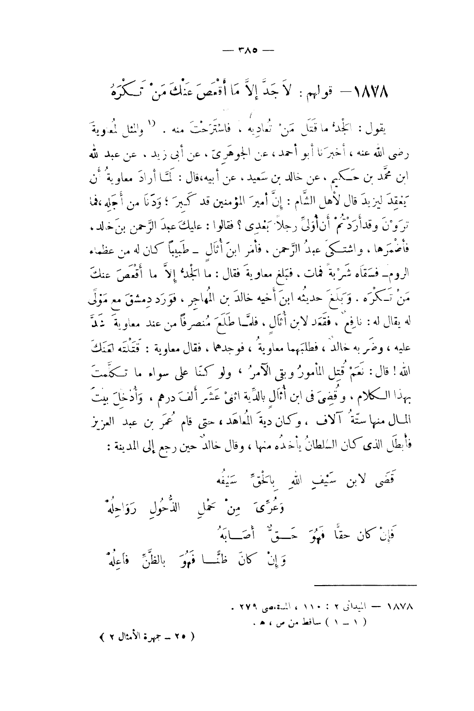 والمثل لمعاوية رضى الله عَنهُ أخبرنَا أَبُو أَحْمد عَن الْجَوْهَرِي عَن أبي زيد عَن عبد الله ابْن مُحَمَّد بن حَكِيم عَن خَالِد بن سعيد عَن أَبِيه قَالَ لما أَرَادَ مُعَاوِيَة أَن يعْقد ليزِيد قَالَ لأهل الشَّام إِن أَمِير الْمُؤمنِينَ قد كبر ودنا من أَجله فَمَا ترَوْنَ وَقد أردتم أَن أولى رجلا بعدى فَقَالُوا عَلَيْك عبد الرَّحْمَن بن خَالِد فأضمرها واشتكى عبد الرَّحْمَن فَأمر ابْن أثالٍ طَبِيبا كَانَ لَهُ من عُظَمَاء الرّوم فَسَقَاهُ شربةً فَمَاتَ فَبلغ مُعَاوِيَة فَقَالَ مَا الْجد إِلَّا مَا أقعص عَنْك من تكره