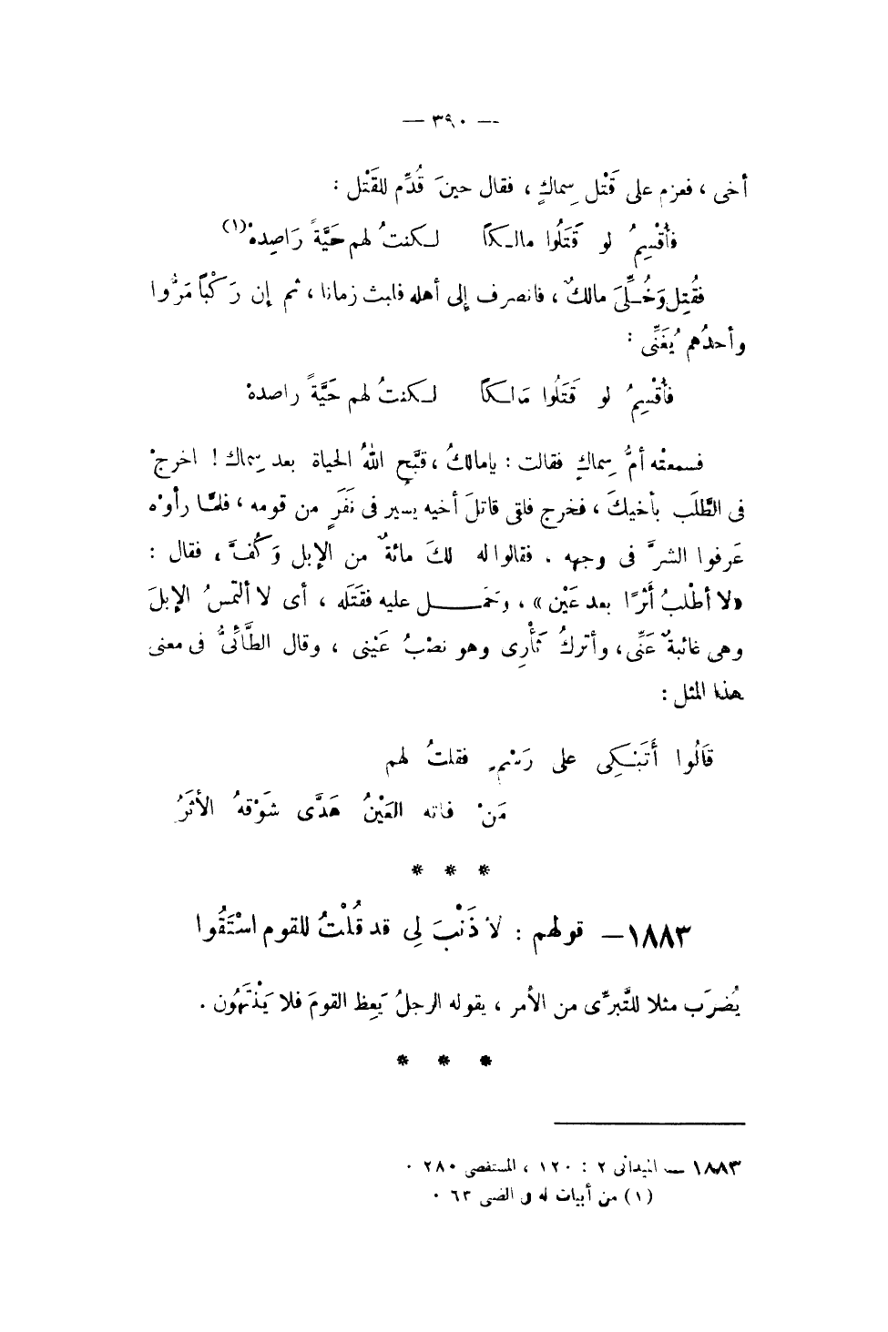 فَسَمعته أم سماكٍ فَقَالَت يَا مَالك قبح الله الْحَيَاة بعد سماك اخْرُج فِي الطّلب بأخيك فَخرج فلقى قَاتل أَخِيه يسير فِي نفرٍ من قومه فَلَمَّا رَأَوْهُ عرفُوا الشَّرّ فِي وَجهه فَقَالُوا لَهُ لَك مائةٌ من الْإِبِل وكف فَقَالَ لَا أطلب أثرا بعد عين وَحمل عَلَيْهِ فَقتله أَي لاألتمس الْإِبِل وَهِي غائبةٌ عَنى وأترك ثأرى وَهُوَ نصب عينى وَقَالَ الطائى فِي معنى هَذَا الْمثل