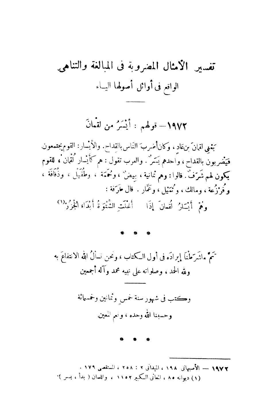 تمّ مَا شرطنا إِيرَاده فِي أول الْكتاب وَنحن نسْأَل الله الِانْتِفَاع بِهِ وَللَّه الْحَمد وصلواته على نبيه مُحَمَّد وَآله أَجْمَعِينَ وَكتب فِي شهور سنة خمس وَثَمَانِينَ وَخَمْسمِائة وحسبنا الله وَحده وَنعم الْمعِين