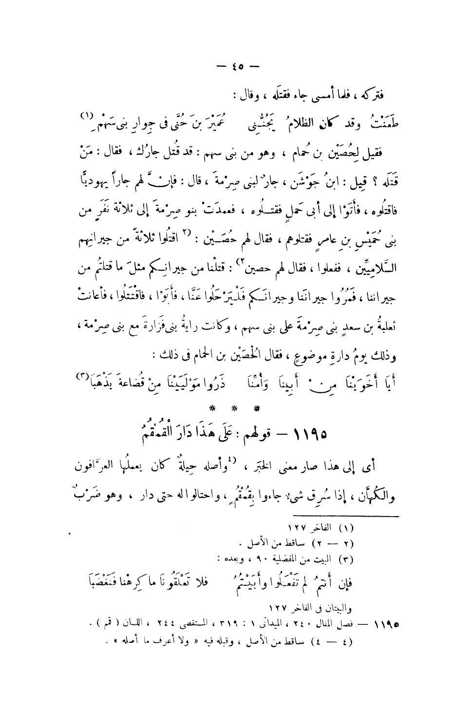 فَقيل لحصين بن حمام وَهُوَ من بنى سهم قد قتل جَارك فَقَالَ من قَتله قيل ابْن جوشن جارٌ لبنى صرمة قَالَ فَإِن لَهُم جاراً يَهُودِيّا فَاقْتُلُوهُ فَأتوا إِلَى أبي حملٍ فَقَتَلُوهُ فعمدت بَنو صرمة إِلَى ثَلَاثَة نفرٍ من بنى حميس بن عَامر فَقَتَلُوهُمْ فَقَالَ لَهُم حُصَيْن اقْتُلُوا ثَلَاثَة من جيرانهم السلاميين فَفَعَلُوا فَقَالَ لَهُم حُصَيْن قتلنَا من جِيرَانكُمْ مثل مَا قتلتم من جيراننا فَمروا جيراننا وجيرانكم فليرحلوا عَنَّا فَأَبَوا فَاقْتَتلُوا فأعانت ثَعْلَبَة بن سعدٍ بنى صرمة على بنى سهم وَكَانَت راية بنى فَزَارَة مَعَ بنى صرمة وَذَلِكَ يَوْم دارة موضوعٍ فَقَالَ الْحصين بن الْحمام فِي ذَلِك