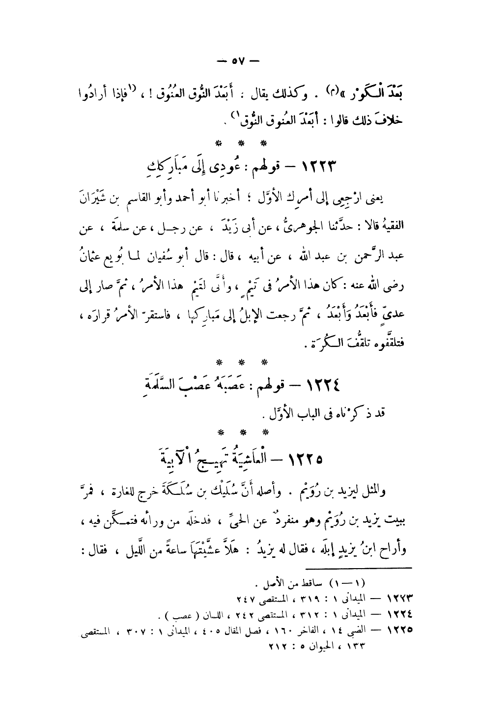 يعْنى ارجعى إِلَى أَمرك الأول أخبرنَا أَبُو أَحْمد وَأَبُو الْقَاسِم بن شيران الْفَقِيه قَالَا حَدثنَا الجوهرى عَن ابى زيد عَن رجل عَن سَلمَة عَن عبد الرَّحْمَن بن عبد الله عَن أَبِيه قَالَ قَالَ أَبُو سُفْيَان لما بُويِعَ عُثْمَان رضى الله عَنهُ كَانَ هَذَا الْأَمر فِي تيمٍ وأتى لتيم هَذَا الْأَمر ثمَّ صَار إِلَى عدىٍ فأبعد وَأبْعد ثمَّ رجعت الْإِبِل إِلَى مباركها فاستقر الْأَمر قراره فتلقفوه تلقف الكرة