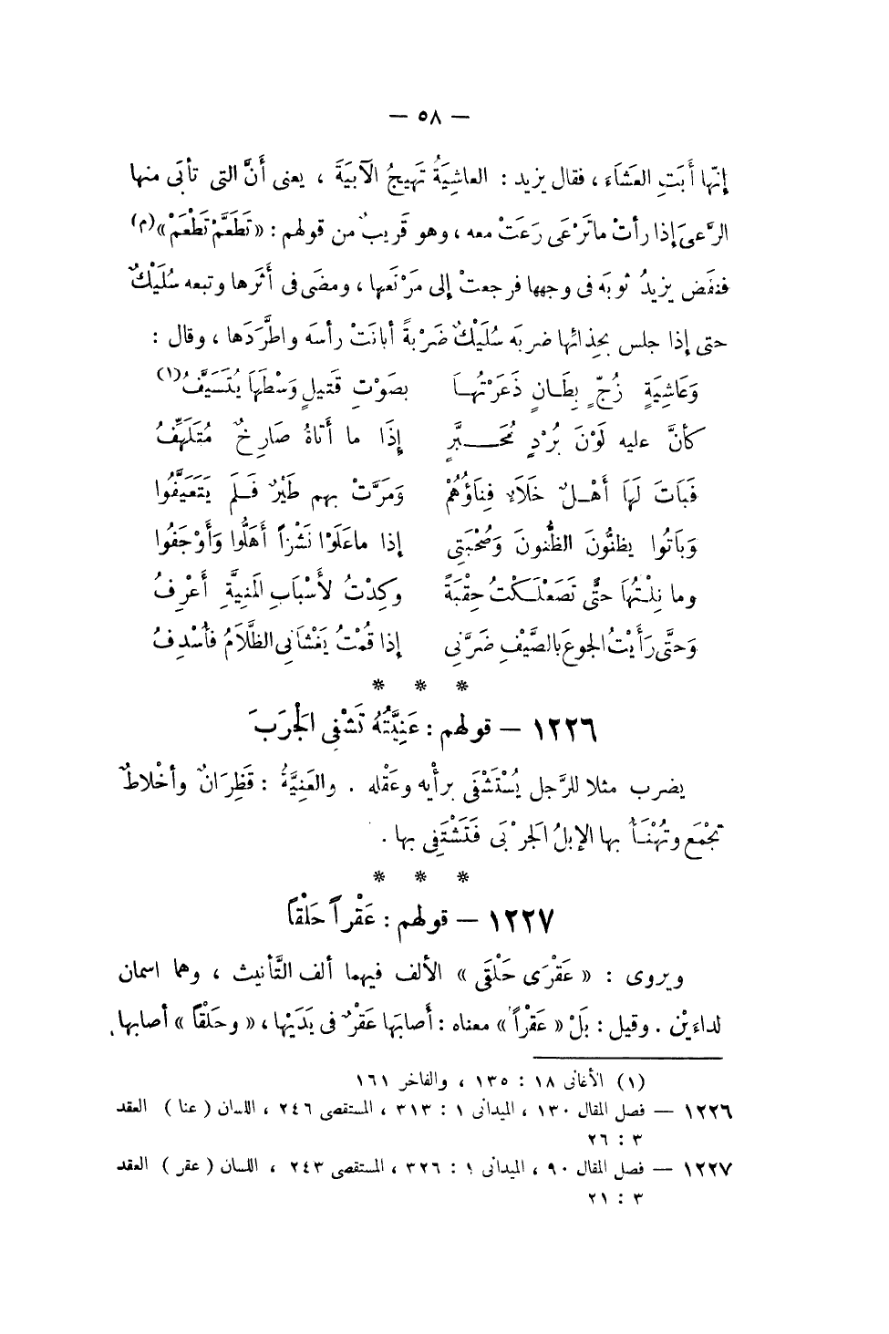 إِنَّهَا أَبَت الْعشَاء فَقَالَ يزِيد العاشية تهيج الآبية يعْنى أَن الَّتِى تأبى مِنْهَا الرعى إِذا رَأَتْ مَا ترعى رعت مَعَه وَهُوَ قريبٌ من قَوْلهم تطعم تطعم فنفض يزِيد ثَوْبه فِي وَجههَا فَرَجَعت إِلَى مرتعها وَمضى فِي أَثَرهَا وَتَبعهُ سليكٌ حَتَّى إِذا جلس بحذائها ضربه سليكٌ ضَرْبَة أبانت رَأسه واطردها وَقَالَ